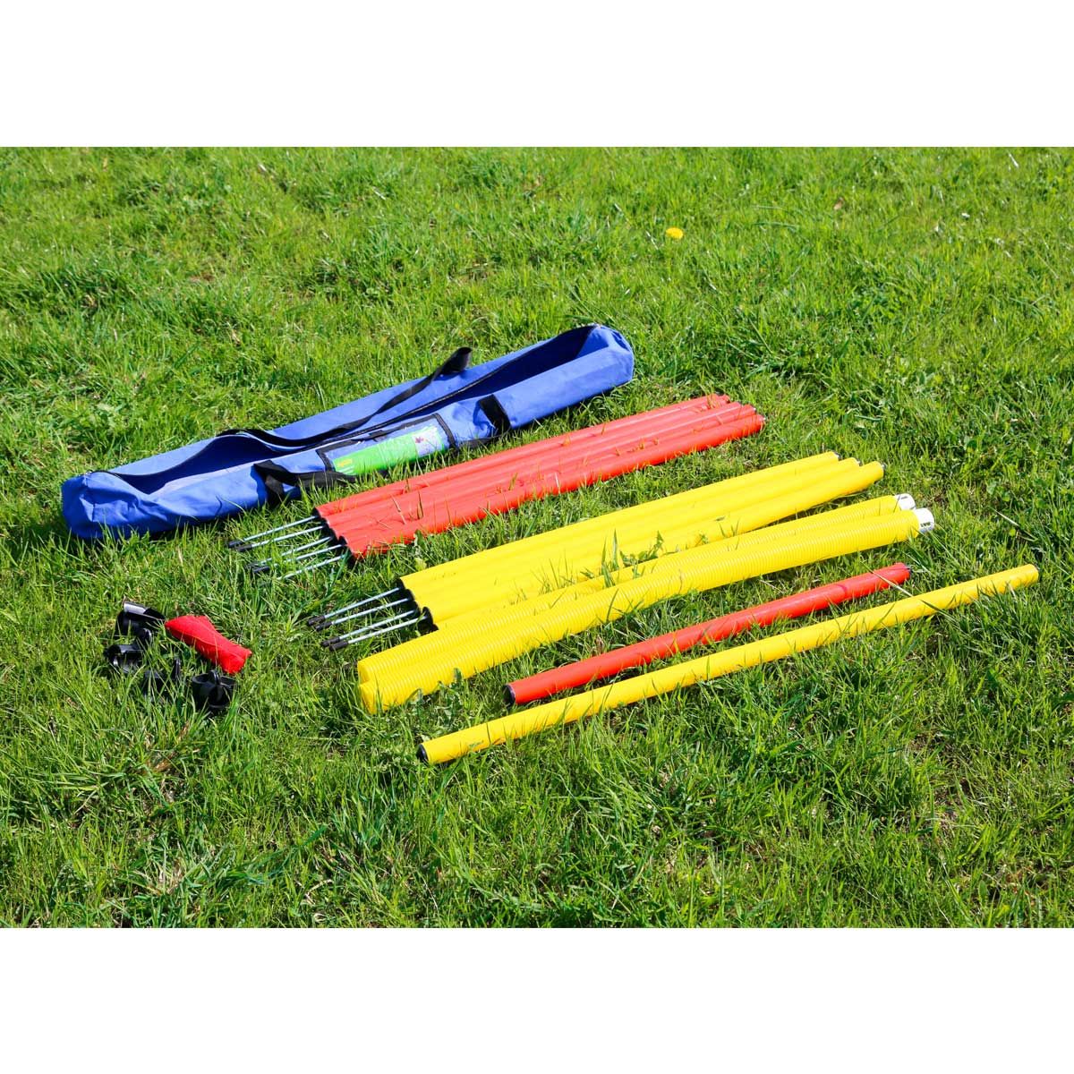 - beleértve 10 műanyag oszlop (80 cm / ø 3 cm) 15 cm-es földelt tüskével, 1 nagy hajtókar (100 cm / ø 3 cm) és 1 kis hajtókar (65 cm / ø 3 cm), 1 gyűrű, csatlakozók és tépőzáras hevederek