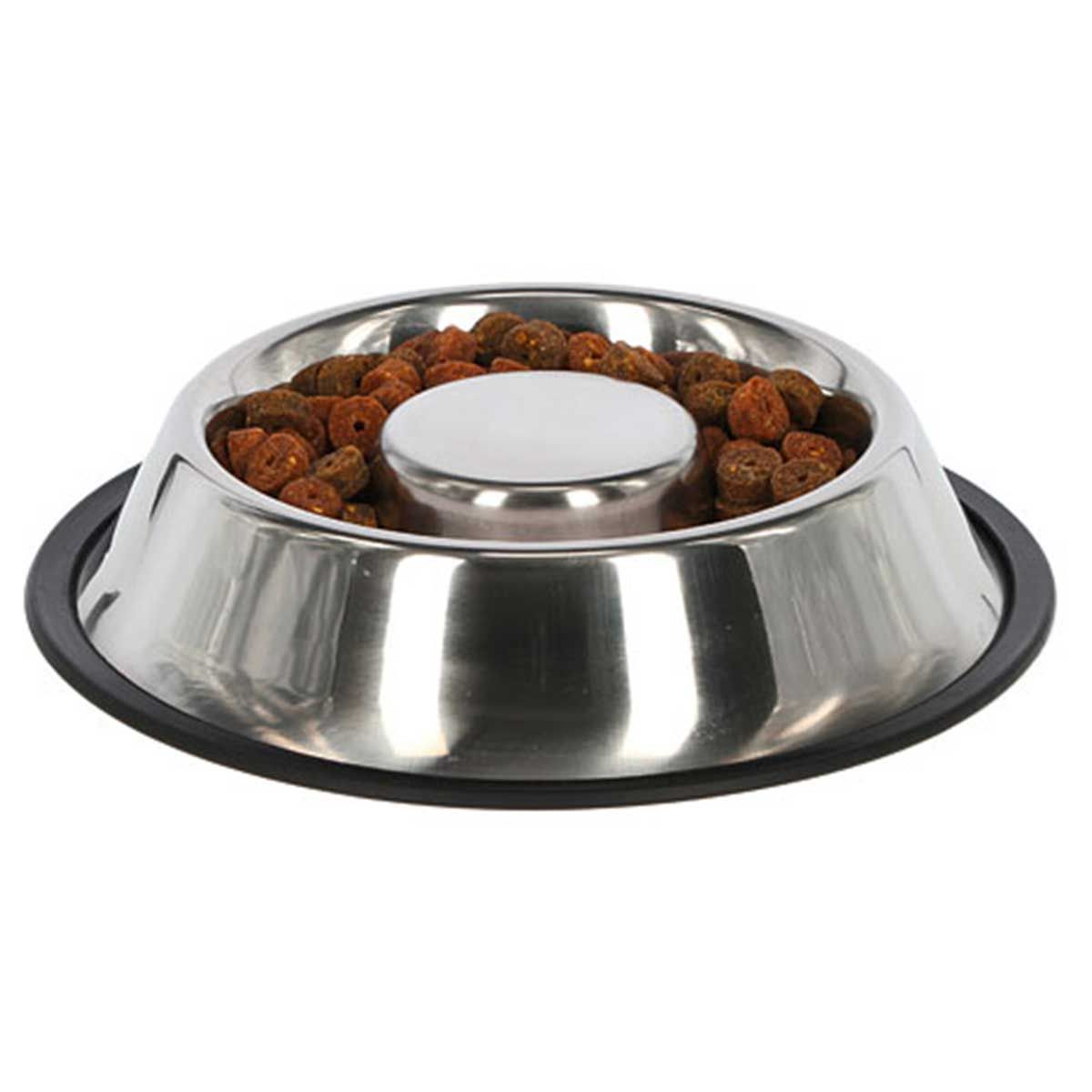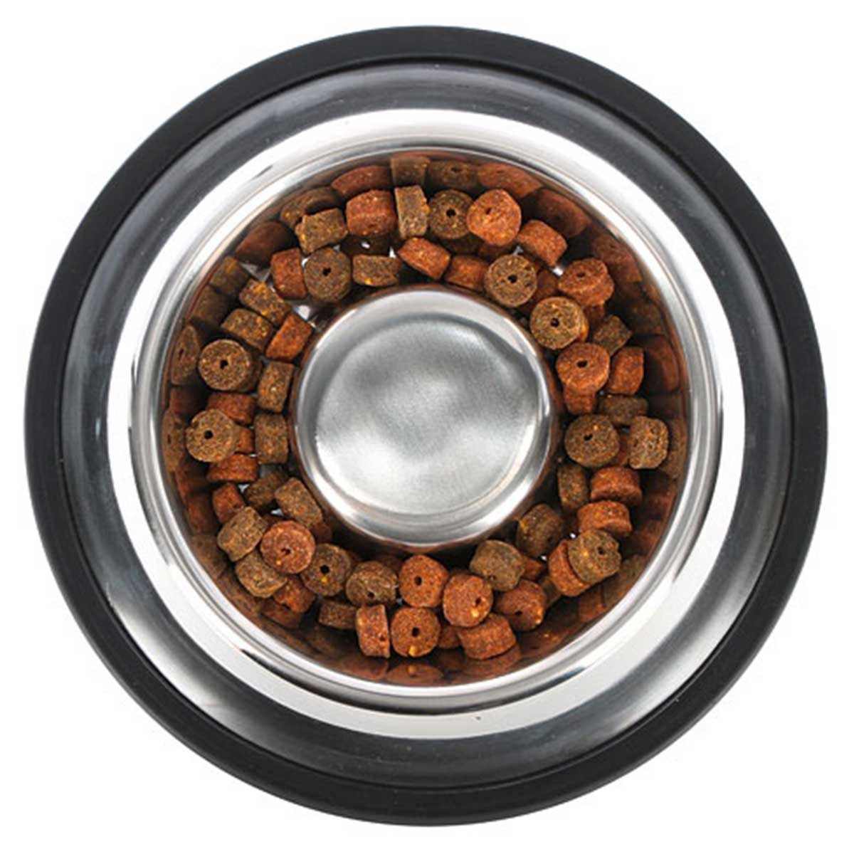 Rozsdamentes acél csöpögésgátló tálPapás és kortyolás megengedett! A kutyatál közepén lévő magasság csökkenti a kutya elhamarkodott evését vagy ivását, és ezért a kiömlést is. Nincs többé bosszantó ételnyom az evőtál mellett