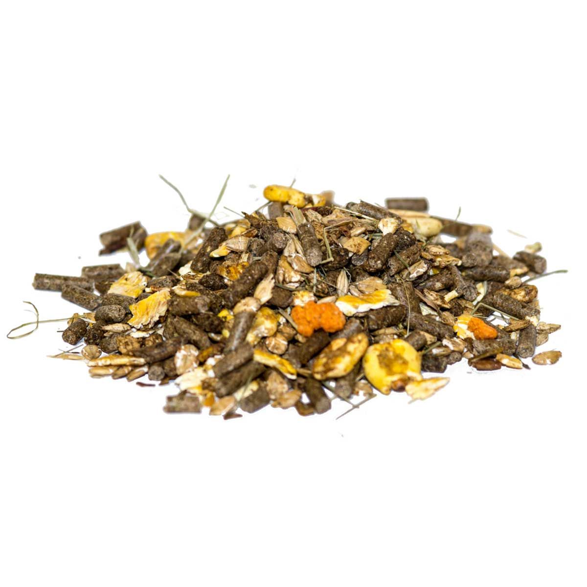 line extrakciós liszt, fűpelyva melegen, levegőn szárítva, almatörköly, lignocellulóz, szentjánoskenyérliszt, kalcium-karbonát, extrudált lenmag, kukoricacsíra, szárított zöldtakarmány, nátrium-klorid, sörélesztő, búza, nátrium-hidrogénkarbonát, magnézium-oxid, monokalcium-foszfát, gyógynövények (kakukkfű, ánizs, mályvacukorgyökér, cickafarkfű).