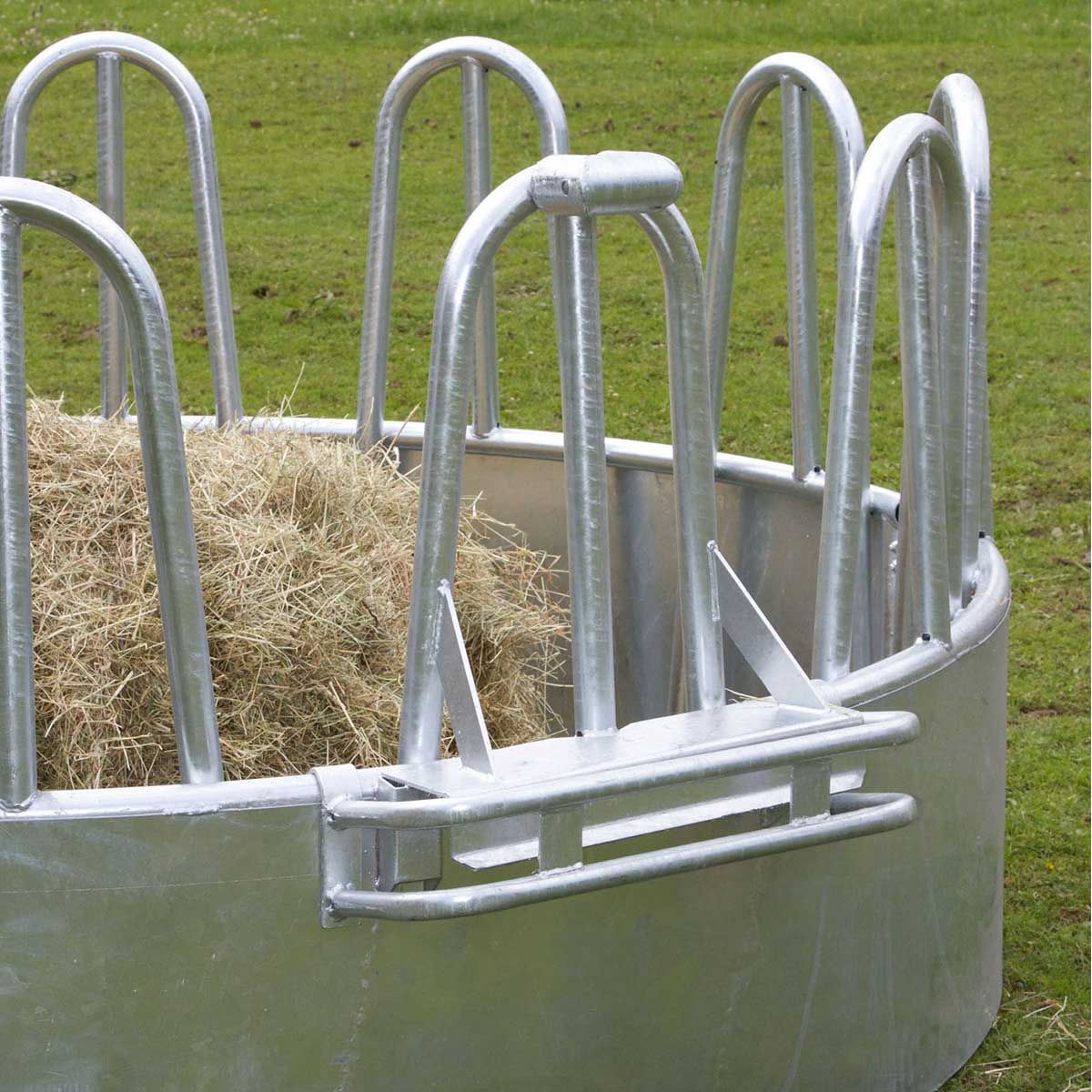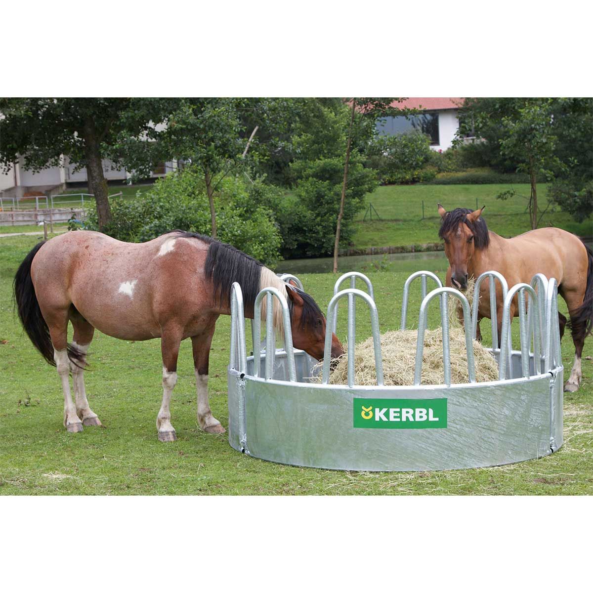 A 12 etetési hellyel rendelkező ló kerek állvány normál és kerek bálákhoz alkalmas . A paliszádos takarmánykerítés lehetővé teszi, hogy az állatok egymástól elkülönítve táplálkozzanak, és így elegendő helyük legyen. A kerek állvány tűzihorganyzott, és a hárompontos vonóhorognak köszönhetően könnyen szállítható. A lovakat a hárompontos védőrúd és a felső lengőkaros védősapka védi a sérülésektől.