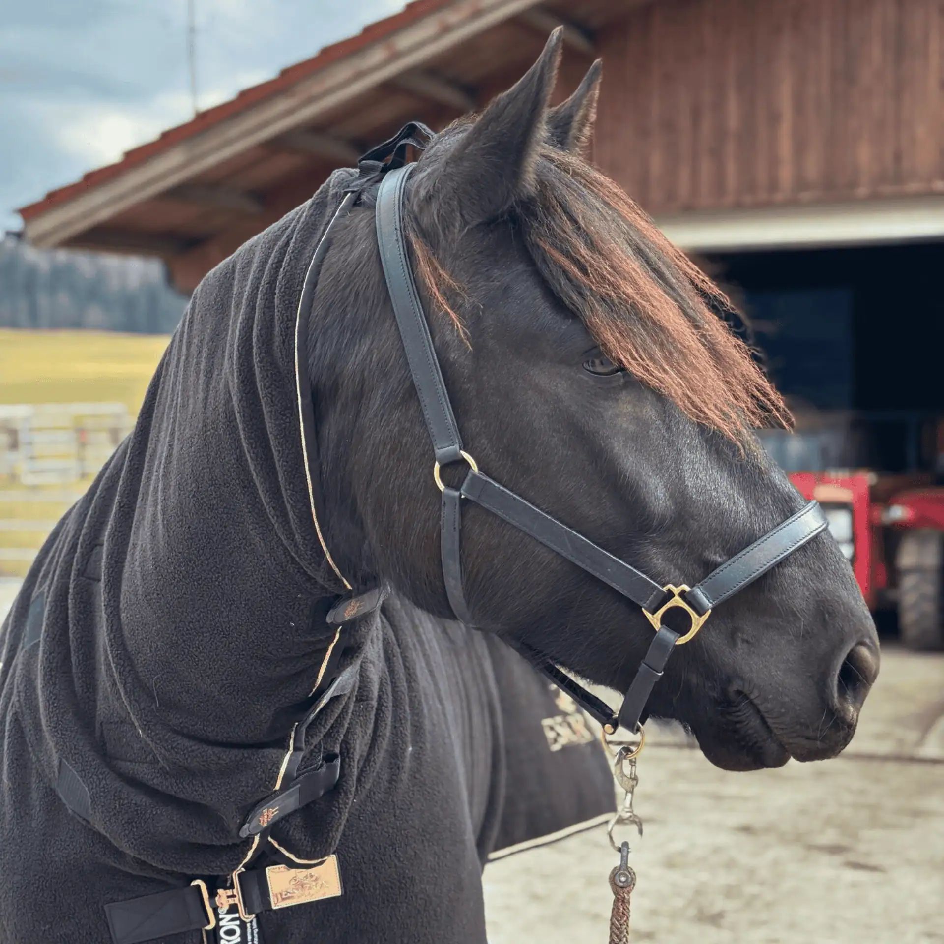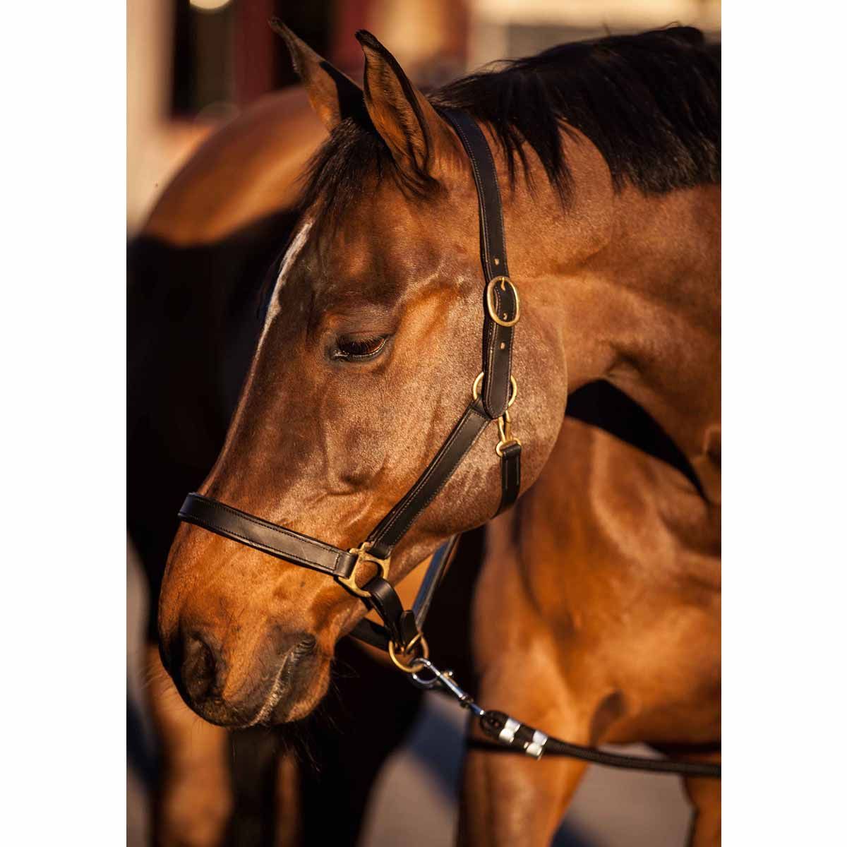 A tartós bőrből készült, dupla varrással készült a kiváló tartósság érdekében. A nyakpánt és az orrpánt csatokkal optimálisan állítható.