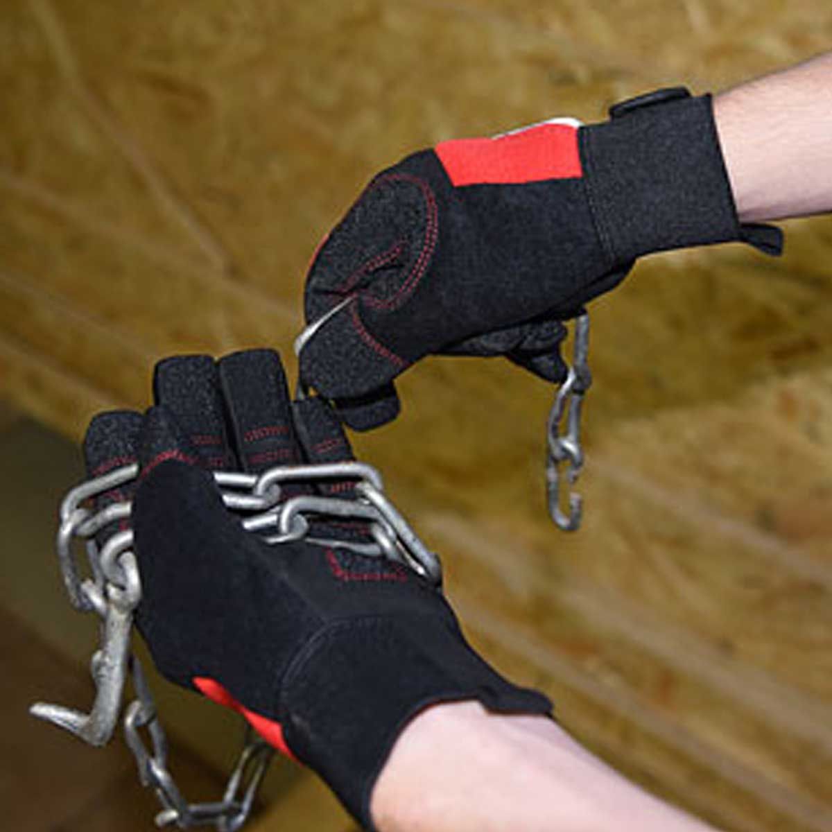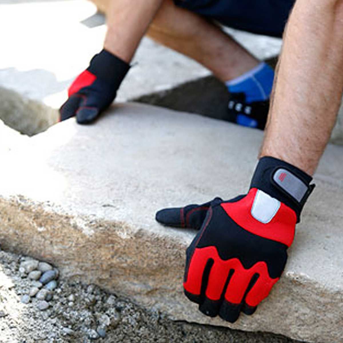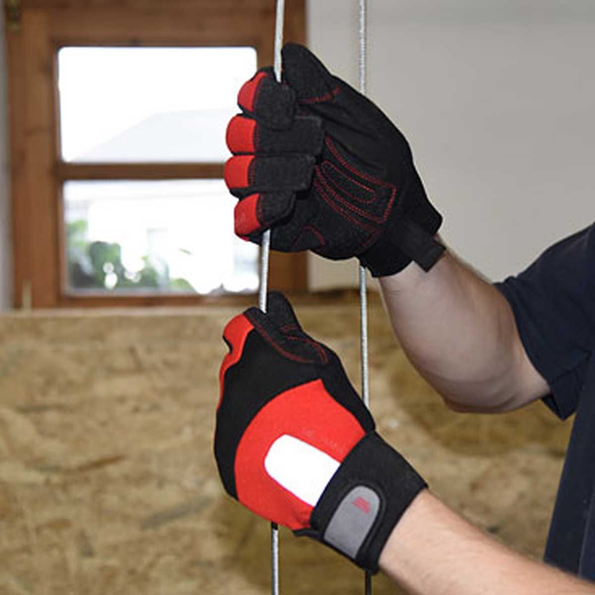 A kesztyű rezgéscsillapítókkal rendelkezik a tenyéren a fáradtságmentes munkavégzés érdekében. A PVC-vel kétszeresen megerősített, érdesített tenyér és ujjak kiváló tartósságot és fogást biztosítanak, és kötéllel való munkavégzésre is alkalmasak. A hüvelyk- és mutatóujj megerősített területe hosszabb viseletet biztosít, a kézháton található rugalmas spandex pedig tökéletes illeszkedést és légáteresztő képességet garantál . A tépőzáras csuklózár megvédi az idegen tárgyak beesésétől. A neoprénből készült kereső ujjpercvédő különleges védelmet nyújt.