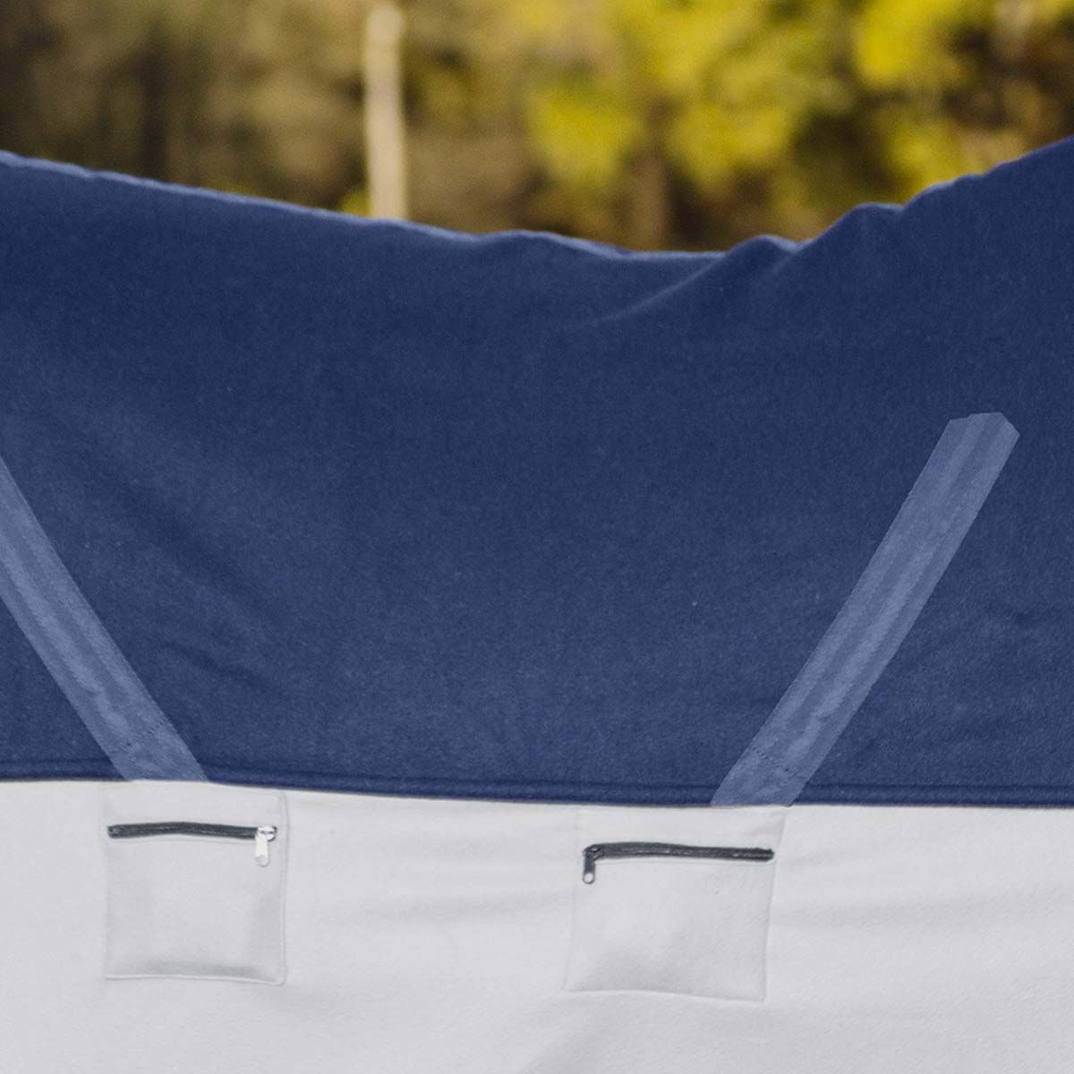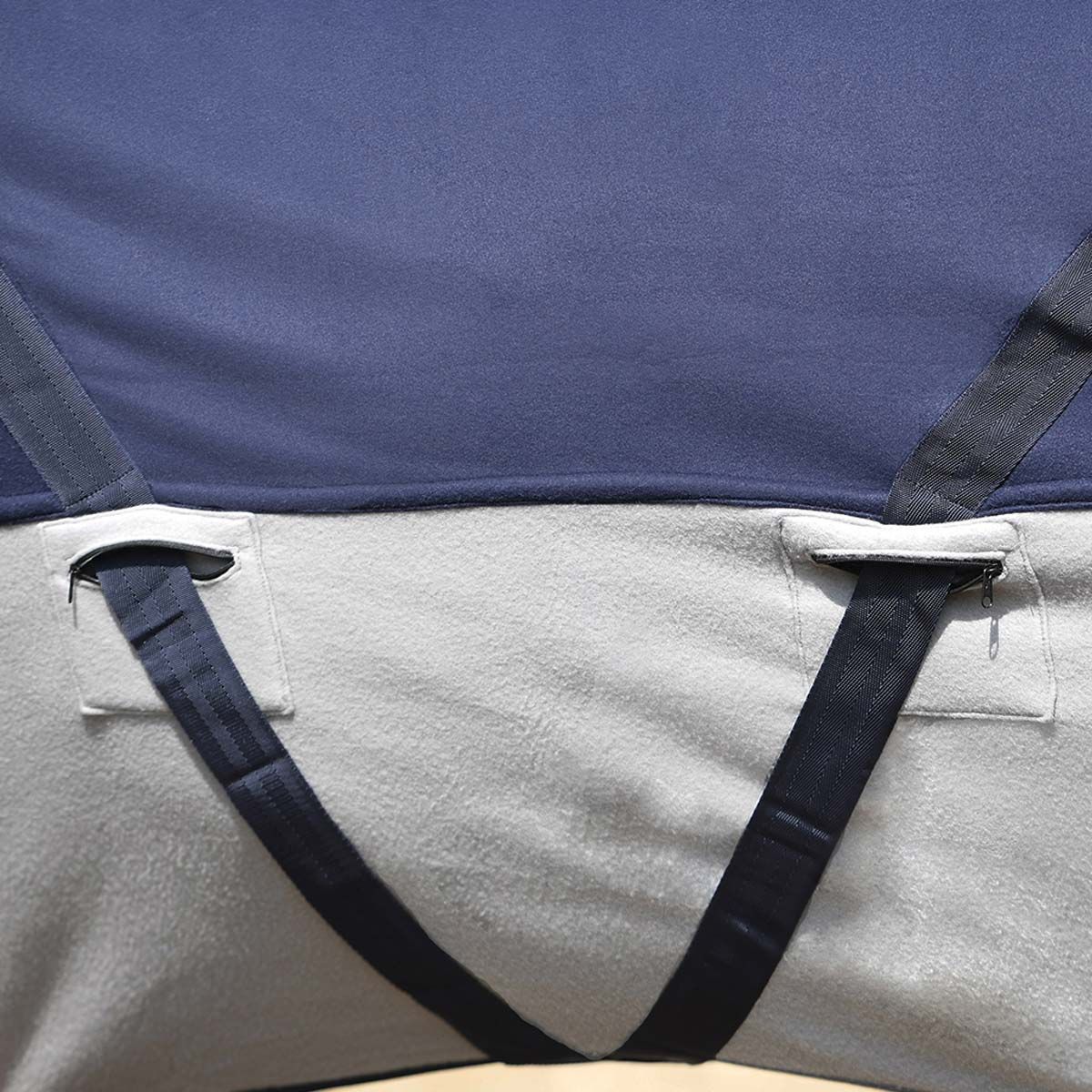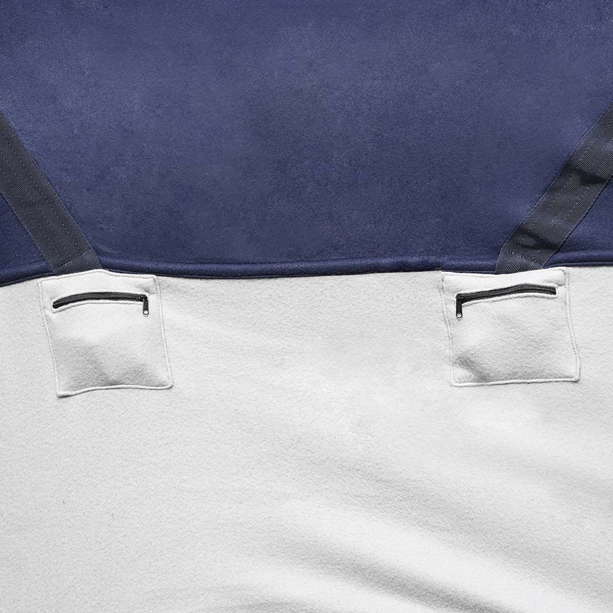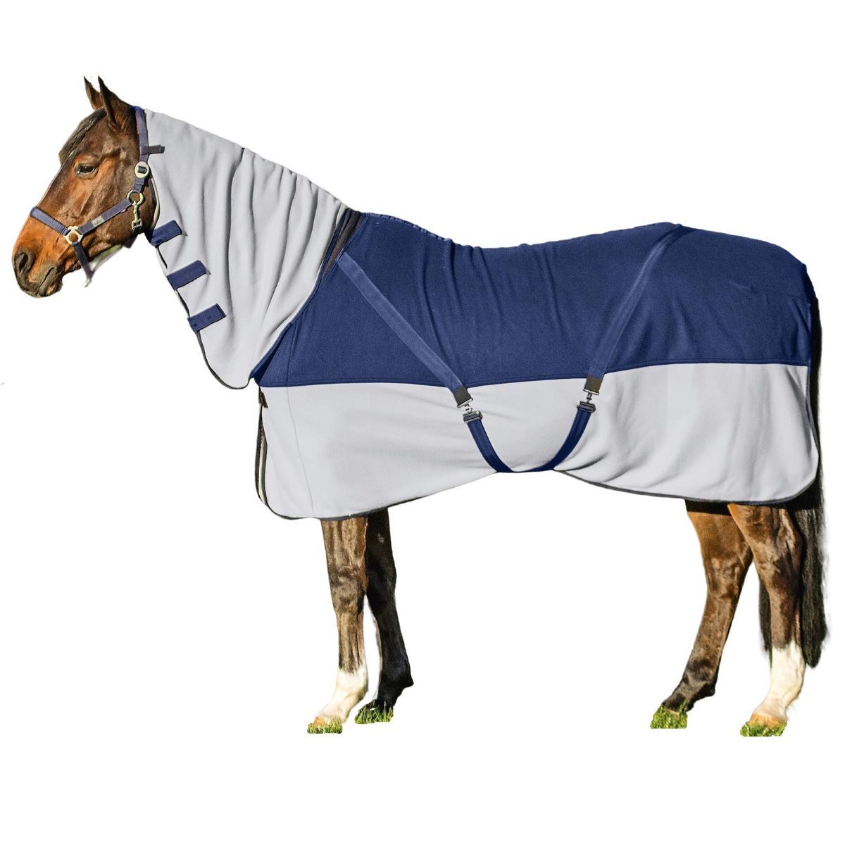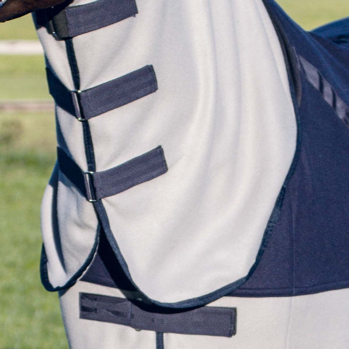 Nagyvonalúan szabott izzadságszőnyeg nyakrésszel és speciális keresztpántokkal az istállókban és a szállításhoz.