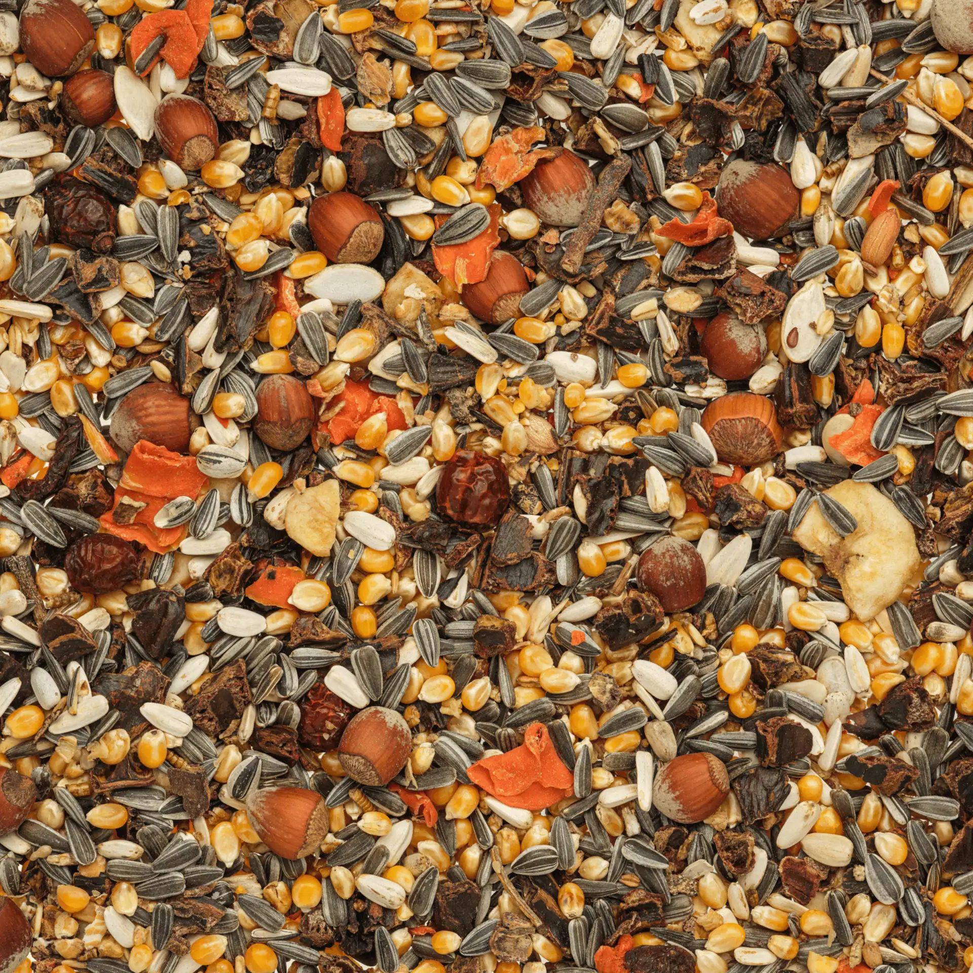 30,00% kiskukorica, 23,00% csíkos napraforgómag, 20,00% szeletelt szentjánoskenyér, 10,00% fehér napraforgómag, 9,30% mogyoró, 2,10% szultán, 2,00% szárított lisztkukac, 1,30% sárgarépaszelet, 1,30% banánchipsz, 0,70% csipkebogyó, 0,30% fehér tökmag.