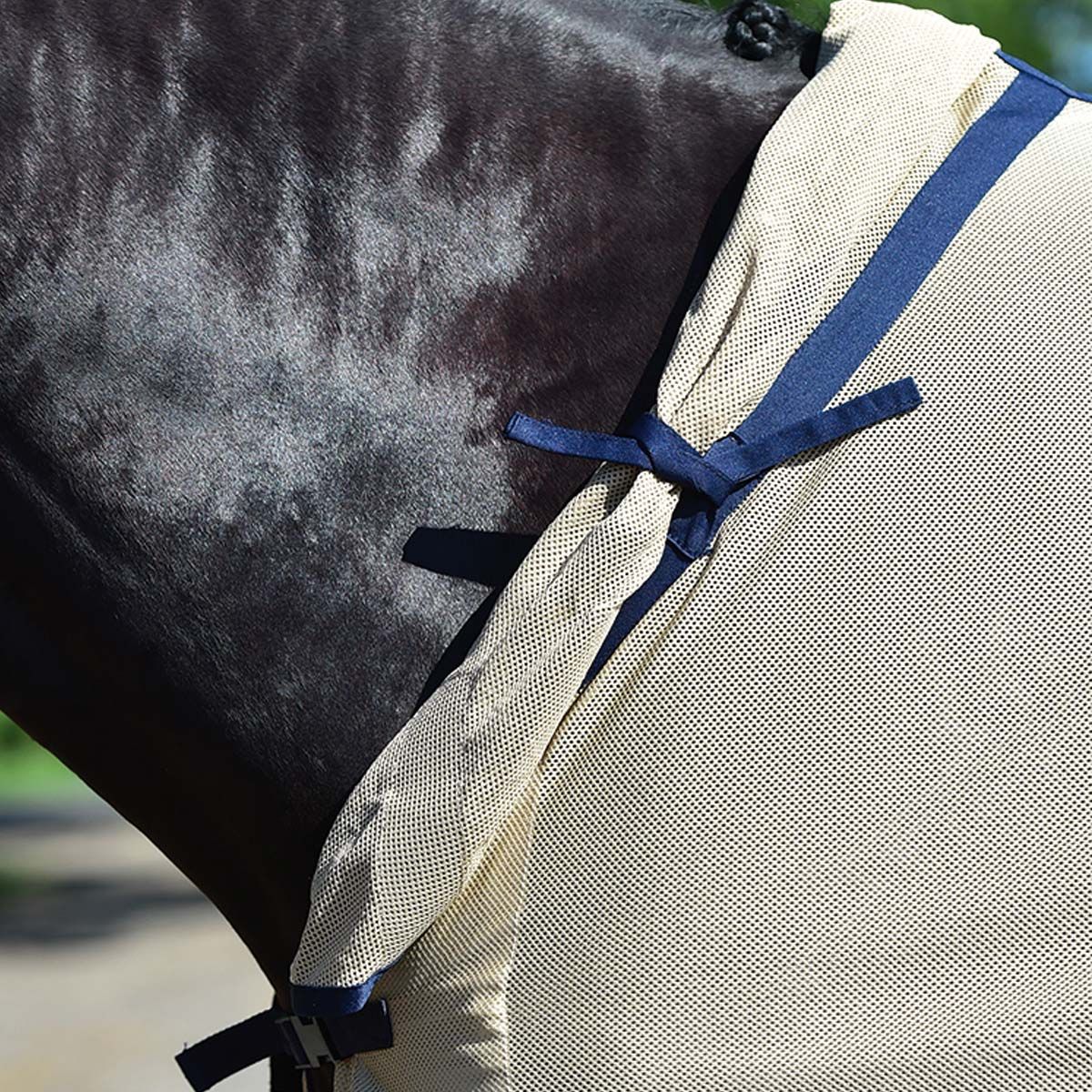 A BUSSE finom szövésű légyfogó lovaglószőnyeg megvédi lovadat a bosszantó legyektől és más rovaroktól. Az ergonomikus takaró szabása oldalsó lovaglási szabással lehetővé teszi az optimális kapcsolatot a lóval. A beépített hám, amely tépőzáras hurkok segítségével a kantárhoz is rögzíthető, és a farokvédő további védelmet nyújt. A nyakrészen kantárral és takaró rögzítéssel, mellzárással, nyeregvágással és farokszíjjal.
