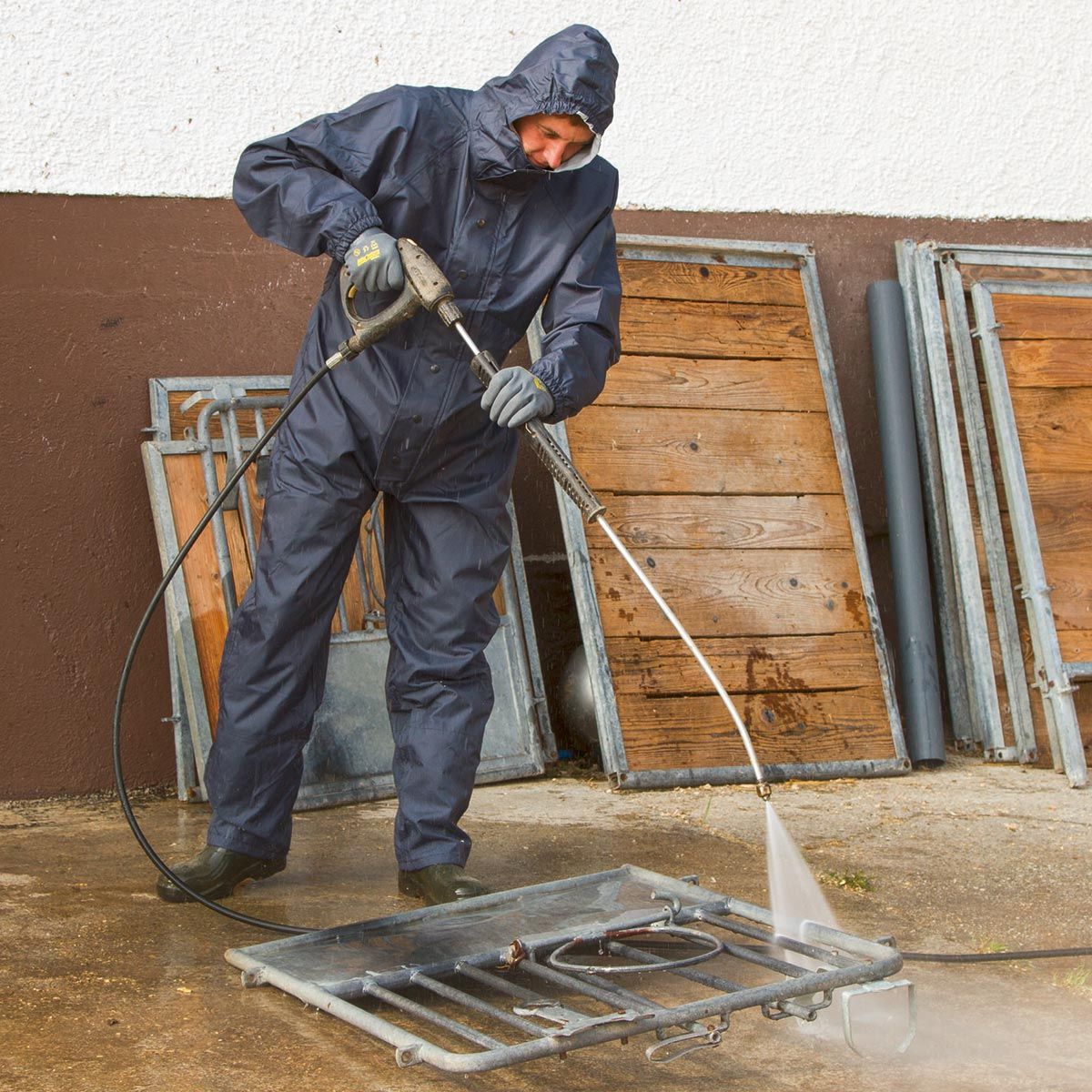 A funkcionális Kerbl mosó- és tisztító overall kapucnival és nyakánál akasztóhurokkal kifejezetten a mezőgazdaságban végzett durva és állandó munkákhoz készült . A tartós anyag vízálló, légáteresztő és különösen alkalmas kültéri munkára. A szorosan illeszkedő mandzsetták és a dupla lábszár mandzsetták optimális védelmet nyújtanak a szennyeződés és a nedvesség ellen.