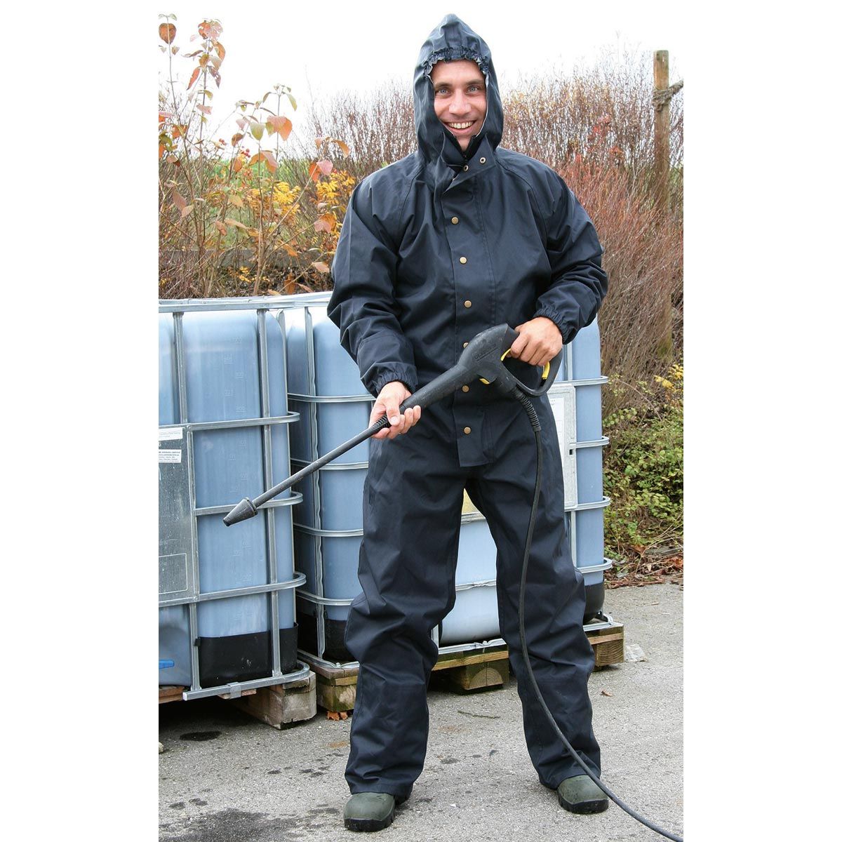 A kapucni az arcrészen rugalmas , a fej hátsó részén pedig tépőzárral rendelkezik, amely a megfelelő testmérethez igazítható. Az overall viselhető csizmán belül vagy csizma fölött. Beépített rugalmas derékpánttal hátul és cipzárral, amelyet egy extra gombos záróvonal fed. A nyak tövénél lévő védőlap megakadályozza a nedvesség behatolását. Vízálló, ragasztott varratokkal. 30° C-on mosható .