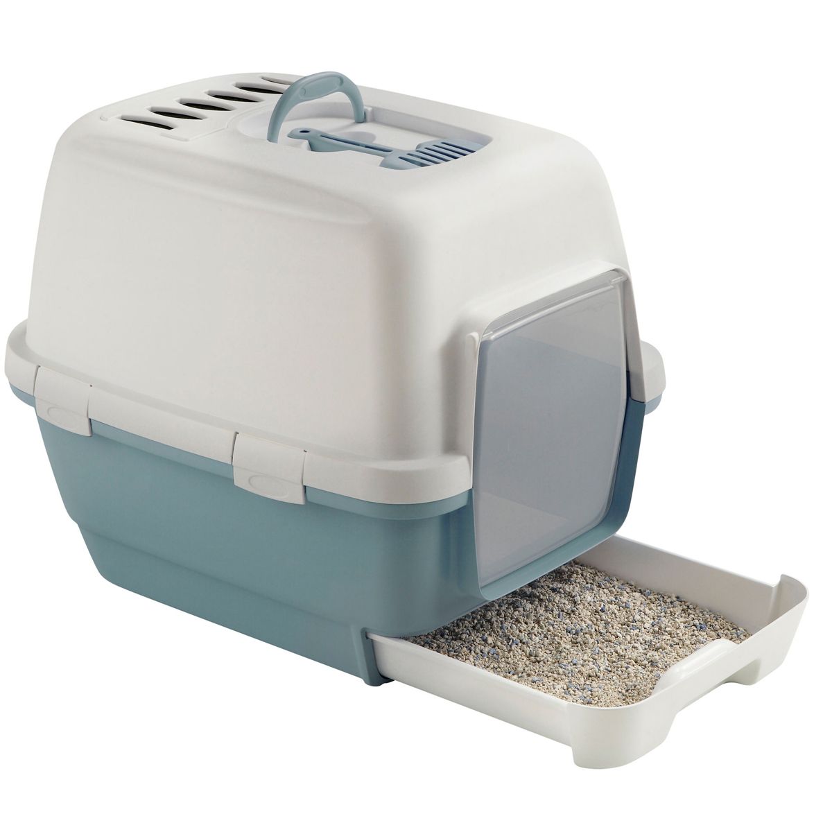 Ez a speciális kapucnis WC macskáknak megkönnyíti a tisztítást a kihúzható macskaalomtartóval. A mellékelt alomkanál eltávolítja a durva, szennyezett macskaalmot a tiszta macskaalomdobozért.