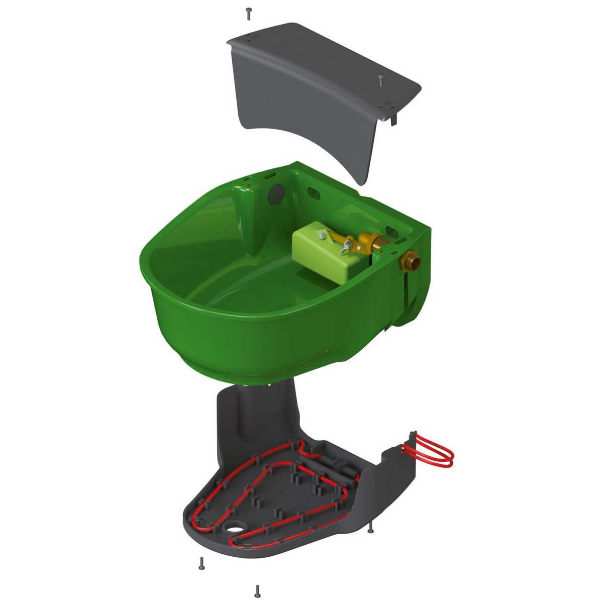 A fűtött állatitató karabinerrel ellátott szelepfedele gyors hozzáférést biztosít, a leeresztő dugó pedig az önitató gyors és egyszerű tisztítását teszi lehetővé. Az úszóval ellátott itató vályú alkalmas cirkulációs fűtési rendszerekhez, és 6,5 l /perc vízáramlással rendelkezik. A Kerbl fűthető önitató bal és jobb oldali ½ hüvelykes csatlakozóval rendelkezik, és csőre és falra szerelhető. A fagyálló úszós itató kétféle feszültséggel (230 V vagy 24 V) és opcionálisan csővezetékfűtéssel is rendelhető. Az itató vályú kb. -15 °C-ig fagyálló.