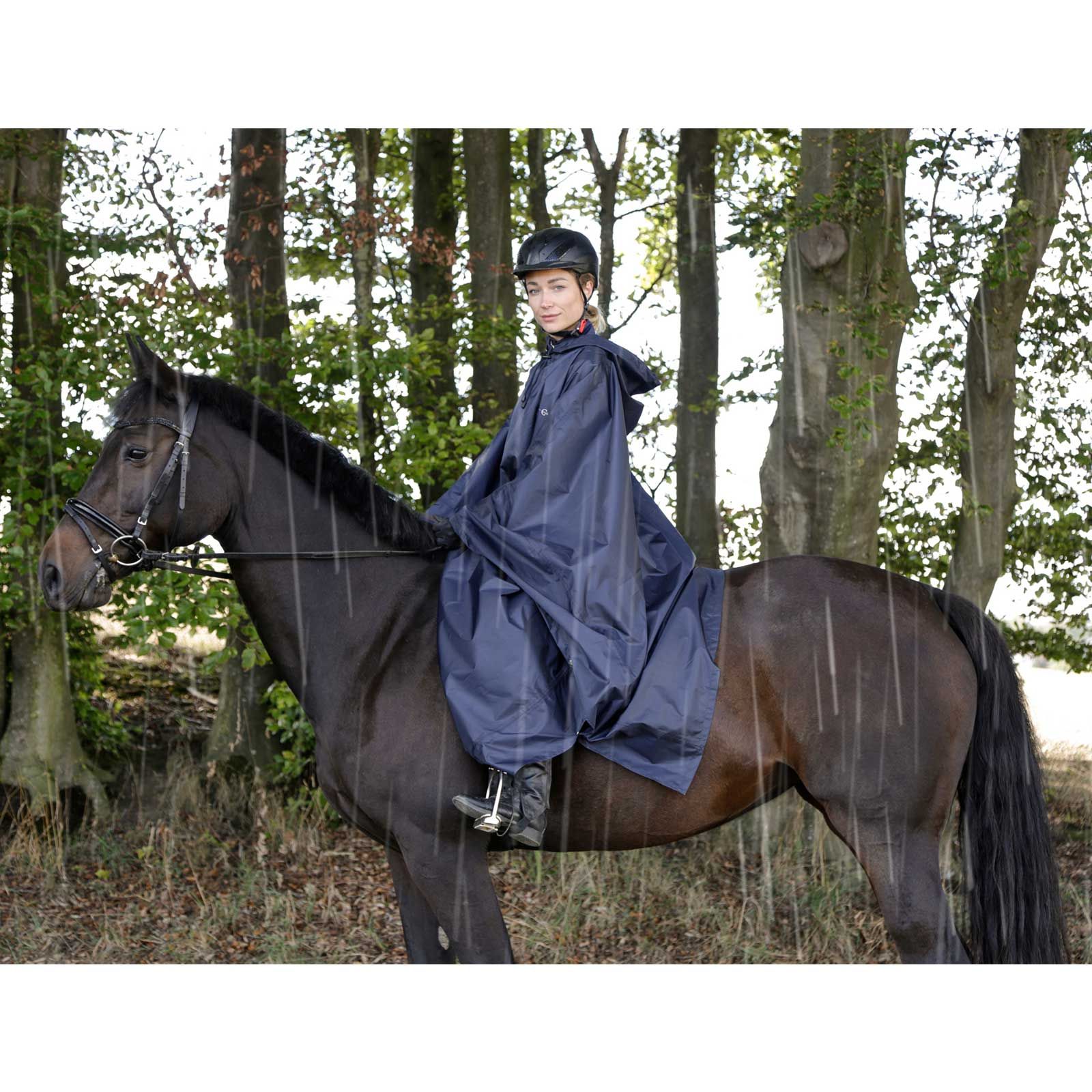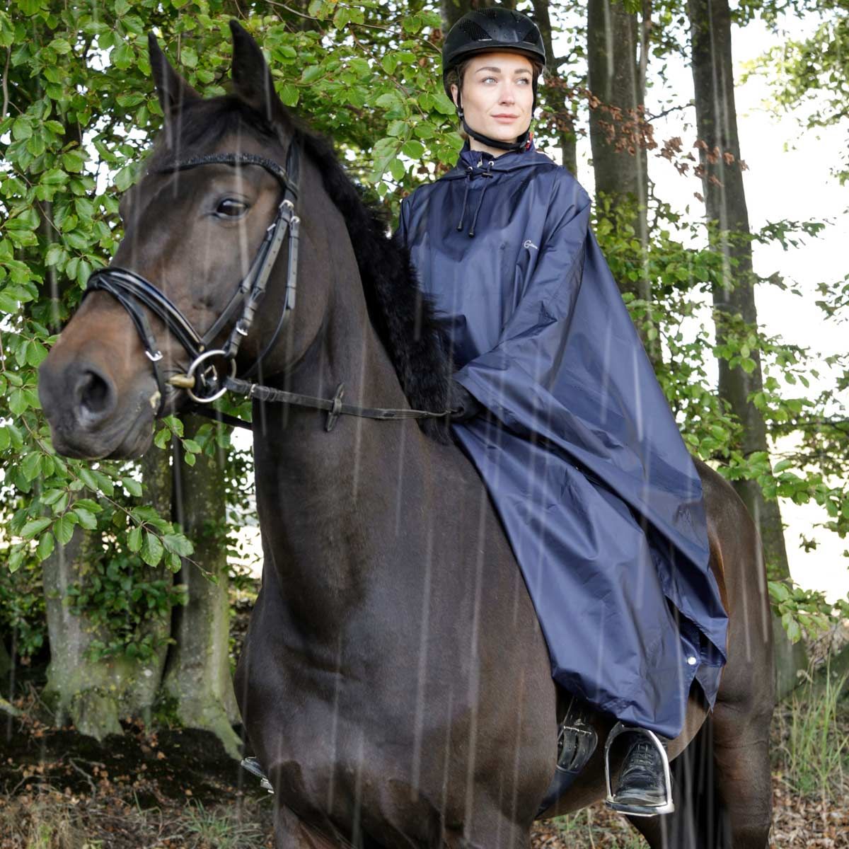 A kifejezetten felnőttek számára tervezett, egy méretben kapható lovas esőponcsó ideális időjárás elleni védelmet nyújt az eső ellen. A lovaglómackó speciális lábhurkai megakadályozzák, hogy a poncsó lovaglás közben leemelkedjen. A nyaknyílásnál és az oldalakon található nyomógombok megkönnyítik a lovas poncsóba való beszállást, és kényelmes illeszkedést biztosítanak. A poncsónak nagyvonalú, integrált kapucnija is van, amely szükség esetén a sisak fölé húzható. A ragasztott varratok és a PU bevonat 100%-os vízállóságot biztosít.