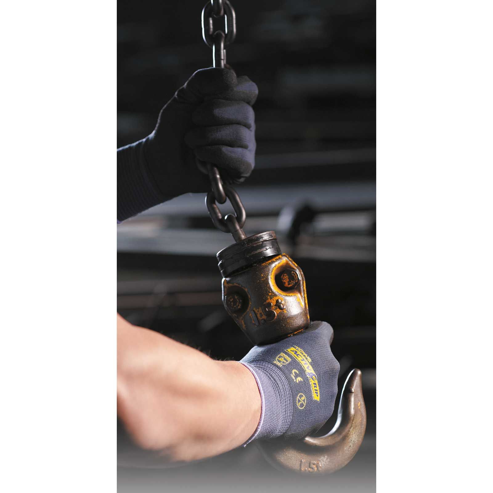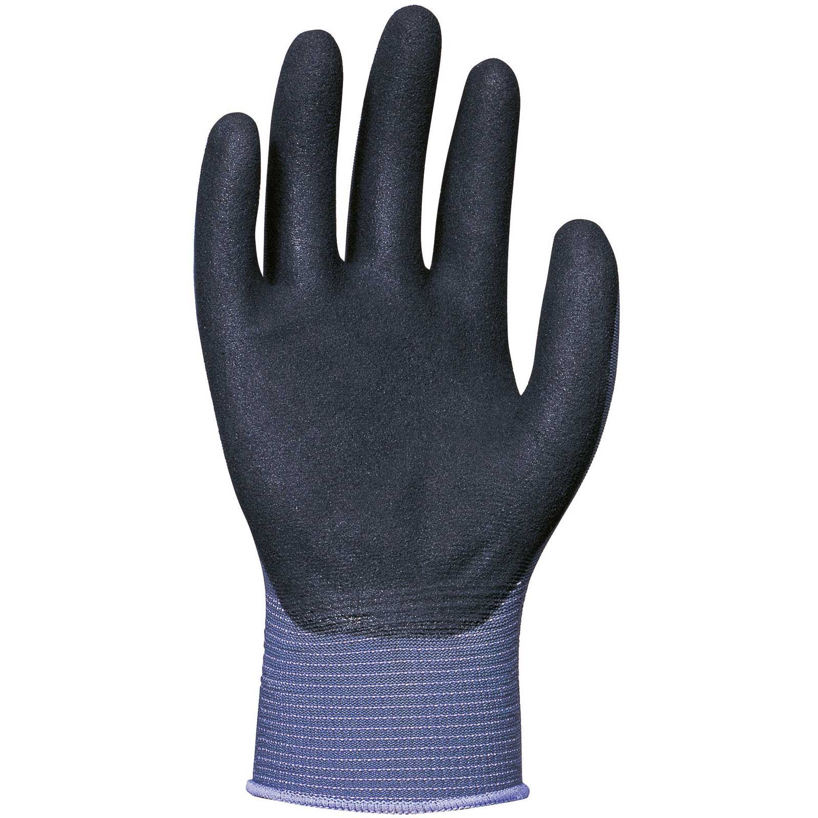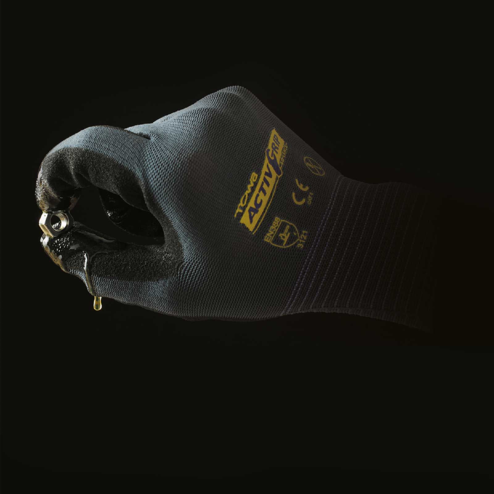 A varrás nélküli, finom kötésű, nejlonból készült kesztyű (13-as ) kiváló minőségű nitril bevonatának köszönhetően olajálló. A "MicroFinish" (a felület szerkezete a tapadókorongokra hasonlít) különösen jó tapadástbiztosít száraz, nedves és olajos körülmények közöttis.