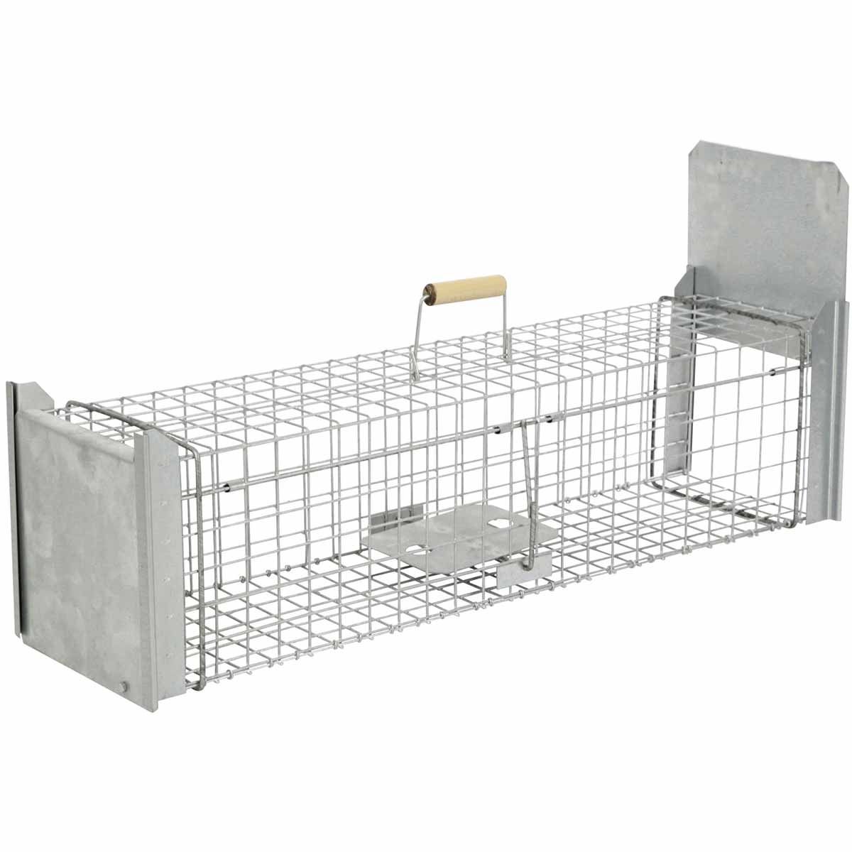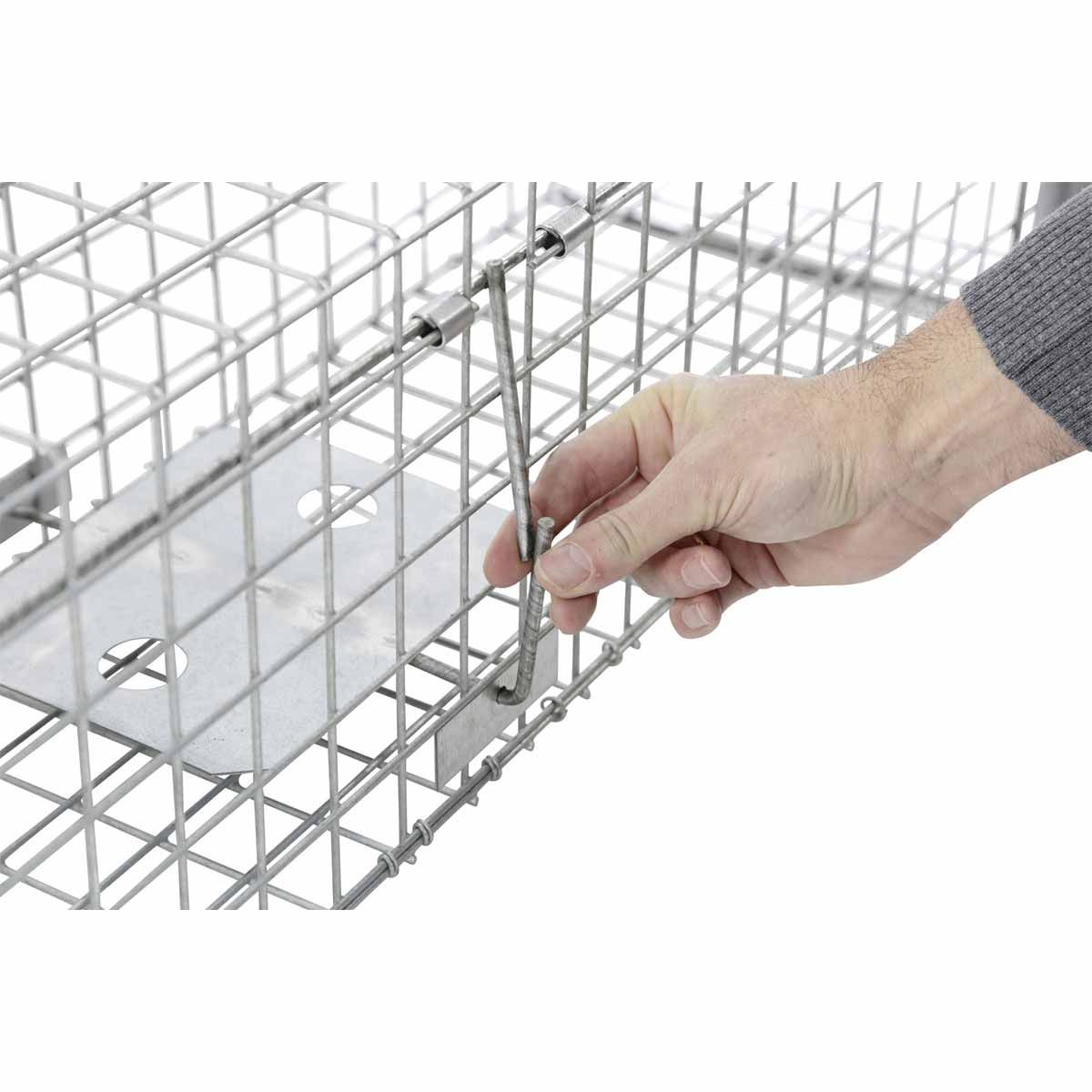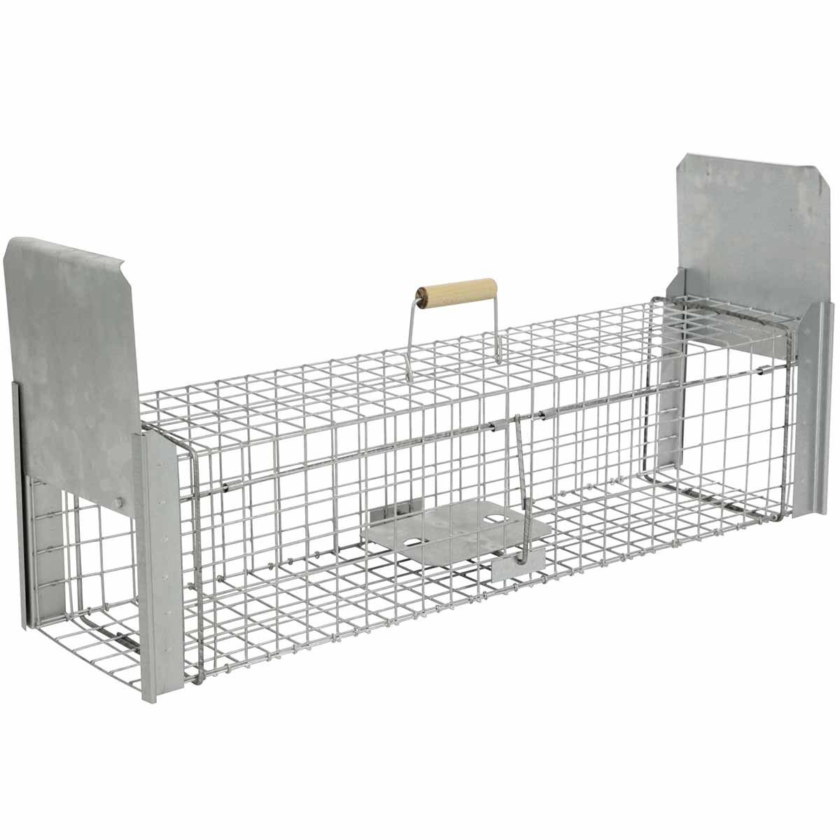 - A csapda különlegessége 118 x 33 x 42 cm: a középen elhelyezett ajtó megkönnyíti a csali elhelyezését a rúgótányér közelében.