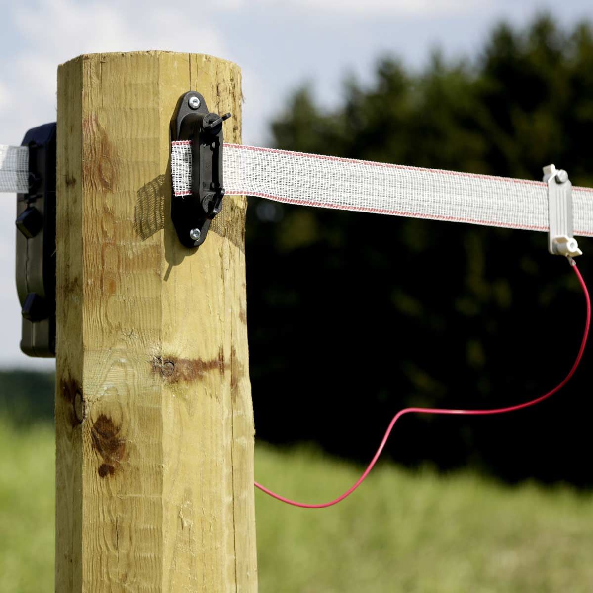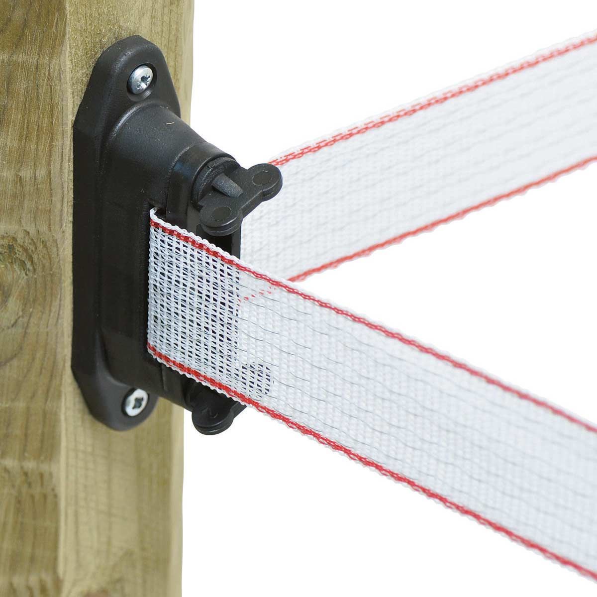 A profi kanyar- és pályaszigetelő nagyon népszerű a karámoknál! Az elektromosan vezető gumibetétek (szabadalmaztatva) nagyon finoman, de megbízhatóan rögzítik a szalagot. A szalagszigetelő lehetővé teszi a legelőkerítéshez használt széles szalagok könnyű felszerelését és egyszerű feszítését.