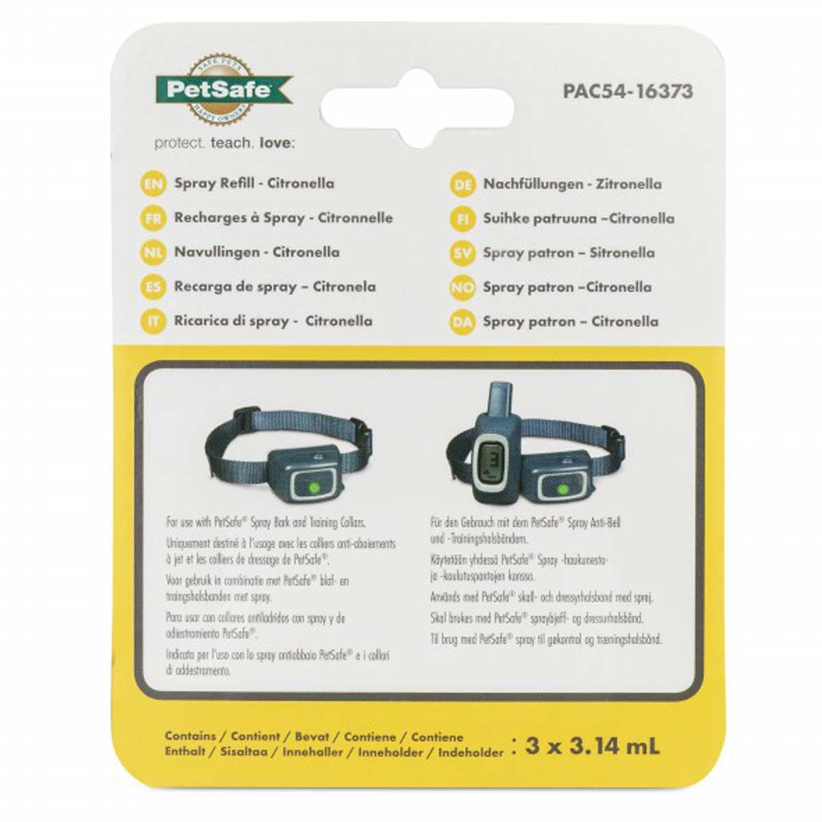 - Kompatibilis nyakörvek A PetSafe® szagtalan utántöltő patronokat a PetSafe® Spray ugatásgátló nyakörvekkel és edzőgallérokkal való használatra tervezték; NEM kompatibilisek a PetSafe® GentleSpray®-vel, az Elite ugatásgátló spray nyakörvvel nagy és kis kutyák számára, vagy az Elite spray trénerekkel nagy és kis kutyák számára.