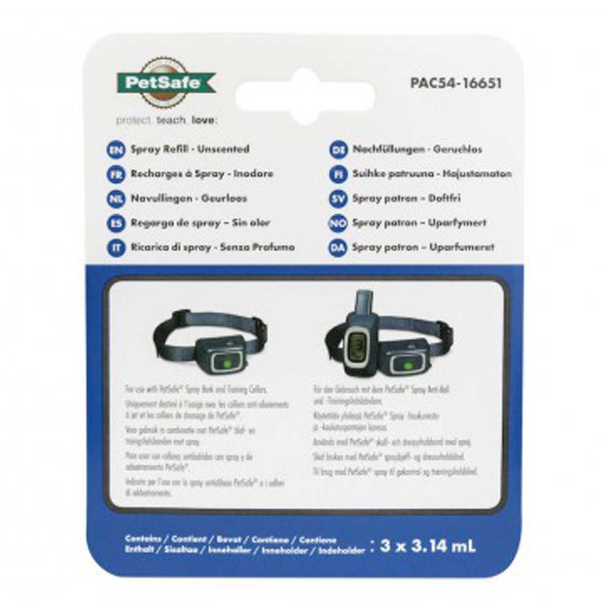 - Kompatibilis nyakörvek – A PetSafe® szagtalan utántöltő patronokat a PetSafe® Spray ugatásgátló nyakörvekkel és edzőgallérokkal való használatra tervezték; NEM kompatibilisek a PetSafe® GentleSpray®-vel, az Elite ugatásgátló spray nyakörvvel nagy és kis kutyák számára, vagy az Elite spray trénerekkel nagy és kis kutyák számára.