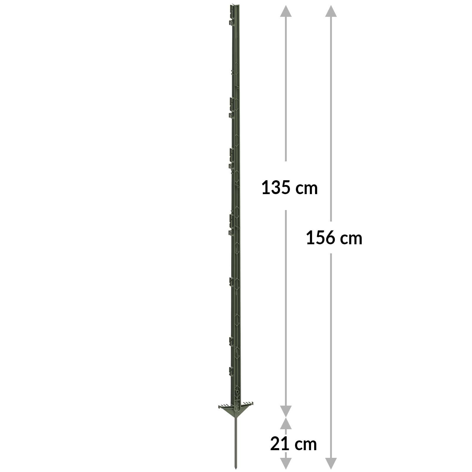 Ez a villanypásztor karó praktikus dupla taposóval rendelkezik, amely segít a karó egyszerű és kényelmes behelyezésében a talajba. A 21 cm hosszú, horganyzott földszög további stabilitást biztosít, és biztosítja, hogy a kerítésoszlop külső hatások, például szél esetén is biztonságosan a földben maradjon. A műanyag villanypásztor karó teljes hossza 156 cm, a föld feletti hossza 135 cm. Ez elegendő magasságot biztosít a nagytestű állatok, például lovak hatékony bekerítéséhez.