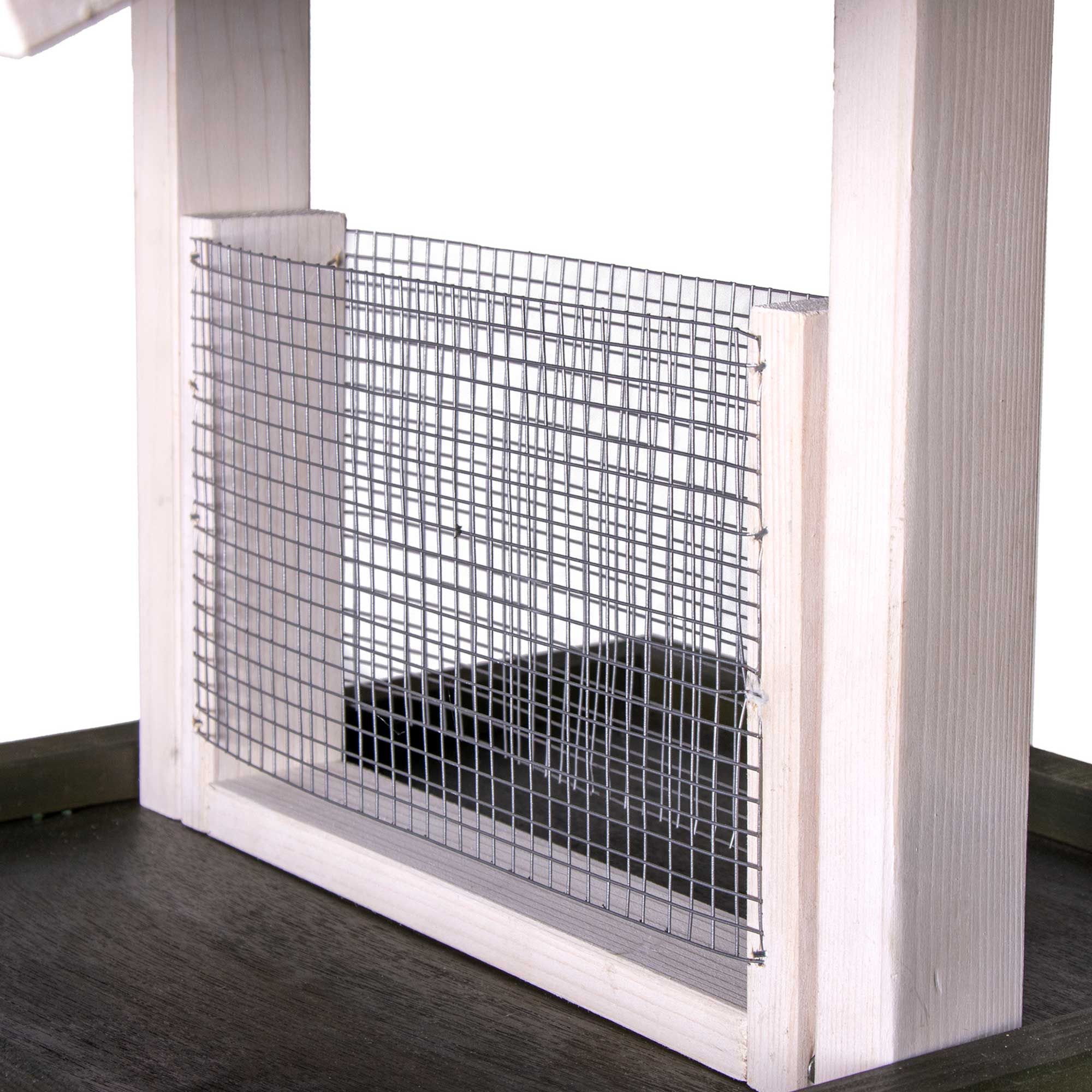 Ez a kültéri madárház a központi etető mellett egy nagy etetőasztallal is rendelkezik. Ez különösen a talajon táplálkozó madarak számára is előnyös. A nagy etetőasztal elegendő helyet biztosít a madaraknak az élelem felvételéhez. A madárház tömör és időjárásálló fából készült, és ideálisan alkalmas kültéri használatra.