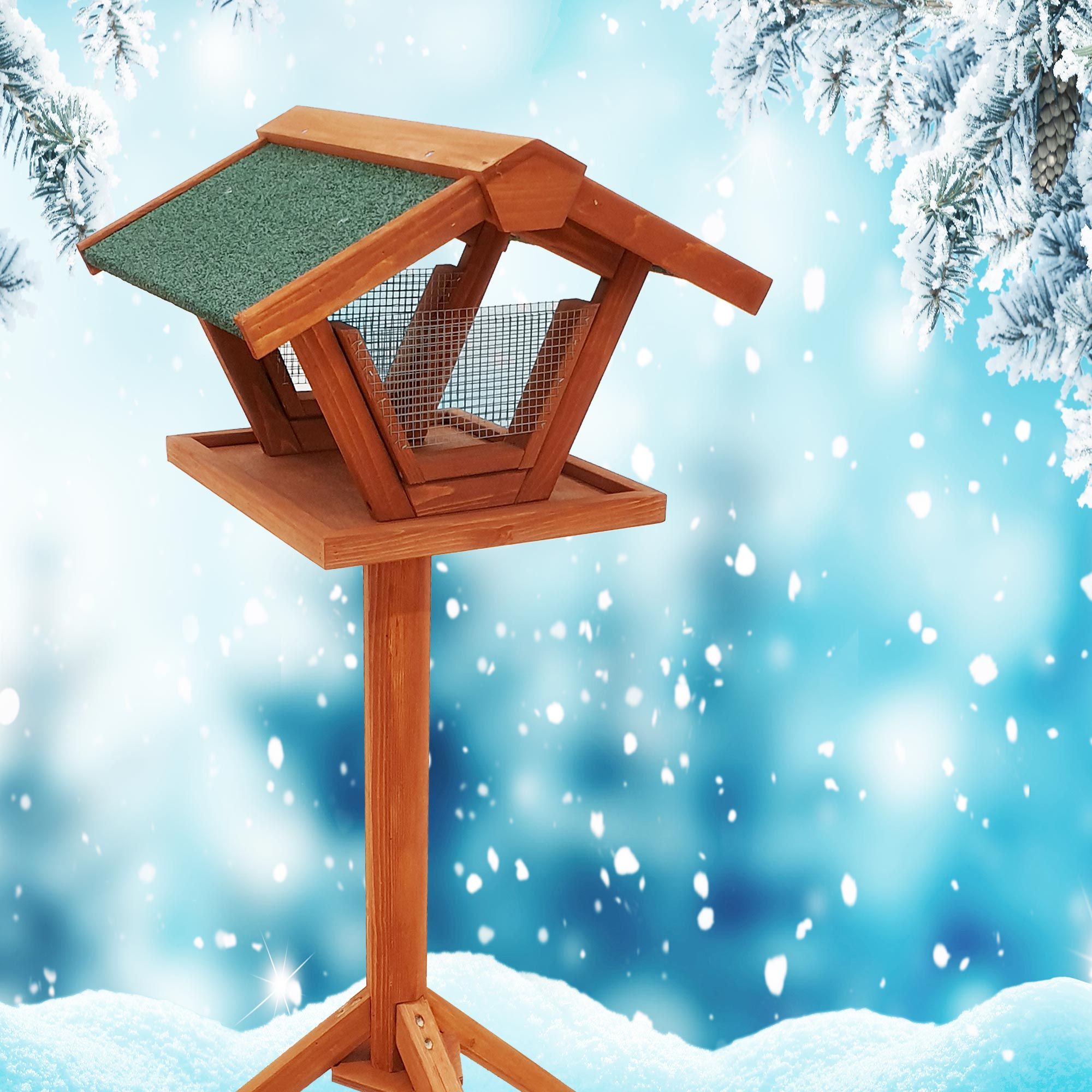 Az állvánnyal ellátott madárház fából készült, és etetőhelyével sokféle madárfajt vonz a kertjébe.