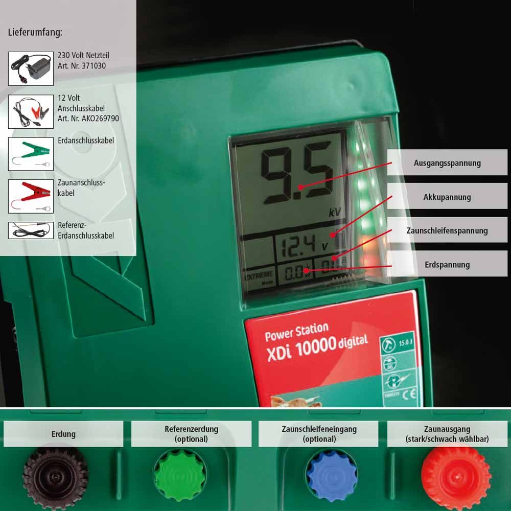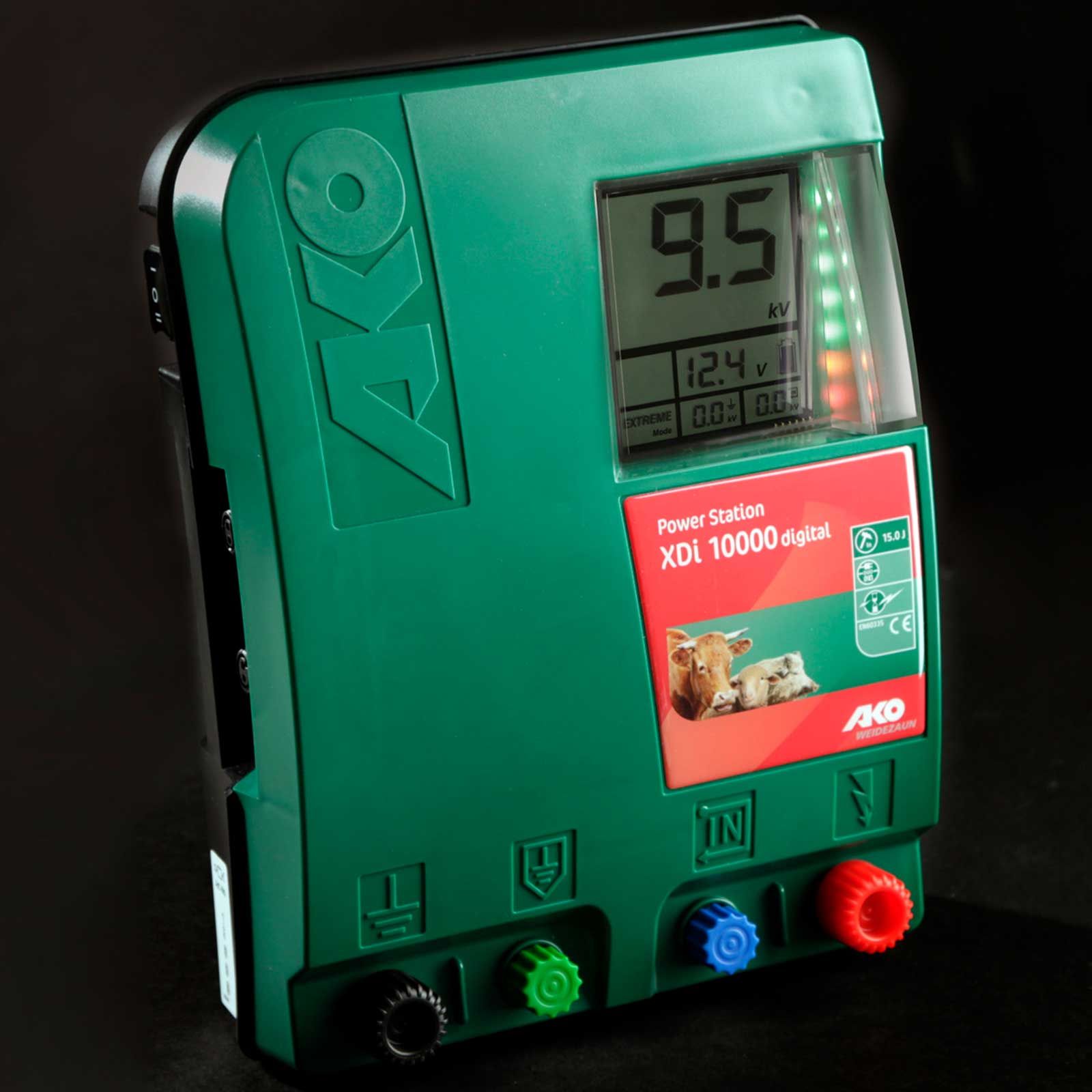 Az AKO Power Station XDi 10000 digital egy rendkívül erős 12/230 voltos DUO villanypásztor készülék hosszú, erős növényzetű kerítésekhez. 10 000 voltos ütőerő és erőteljes 15 joule ütőerő biztosítja a különösen magas szintű védelmet. Az állatok tisztelni fogják a kerítést ezzel a készülékkel, és még a növényzetnek sincs esélye az erős villanypásztor készülékkel szemben. A Power Station XDi 10000 digitális villanypásztor készülék hálózati csatlakozással, akkumulátorral vagy napelemes rendszerrel működtethető, és könnyen kezelhető. A készülék extra nagy, állandóan megvilágított, modern digitális kijelzővel rendelkezik. A LED-es oszlopdiagram kijelző a kerítés aktuális állapotának gyors felismerését és a készülék nagyobb távolságból történő felügyeletét teszi lehetővé.