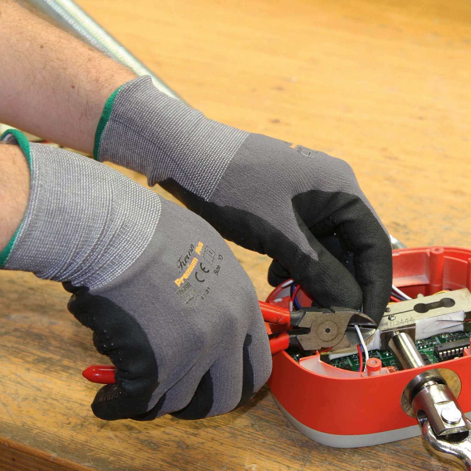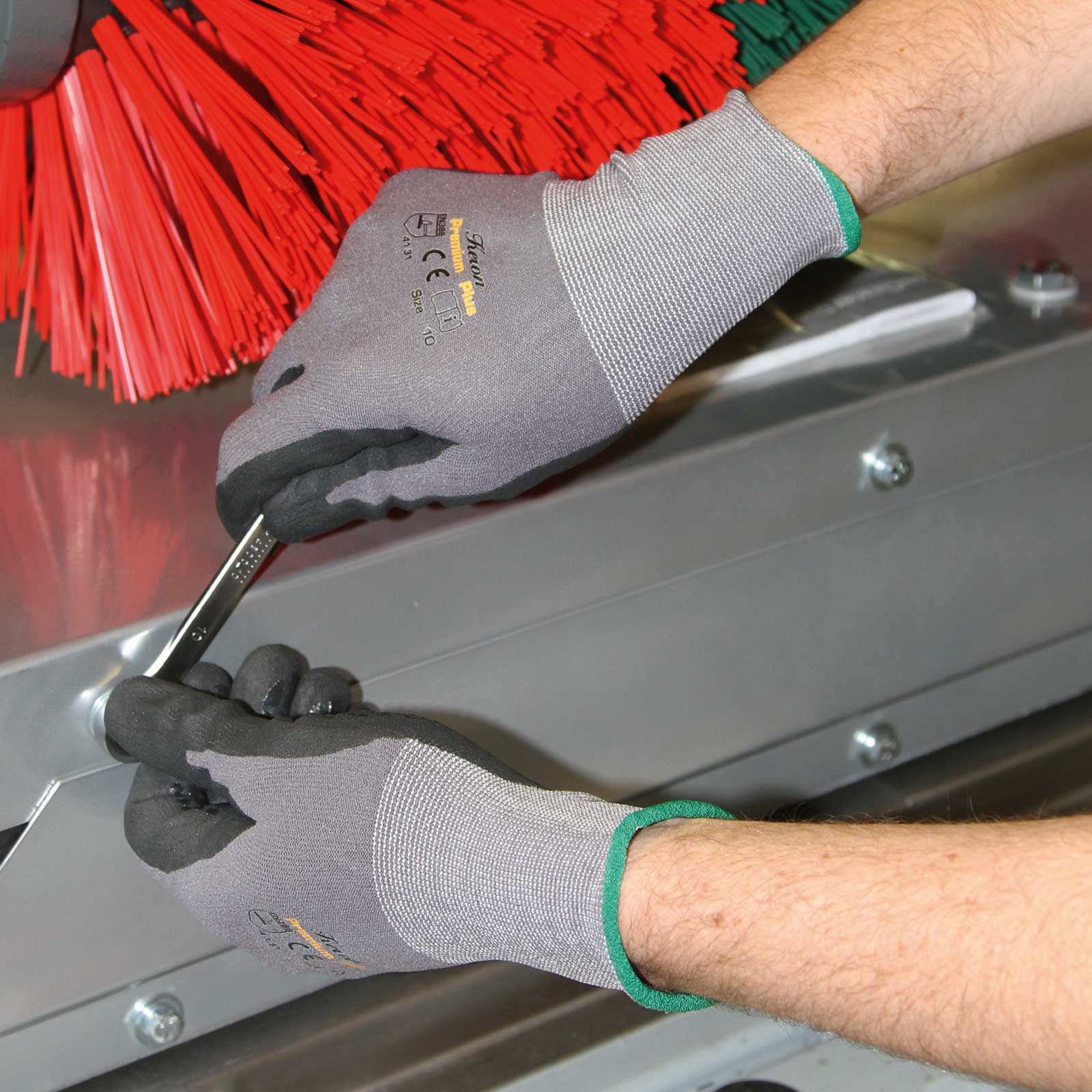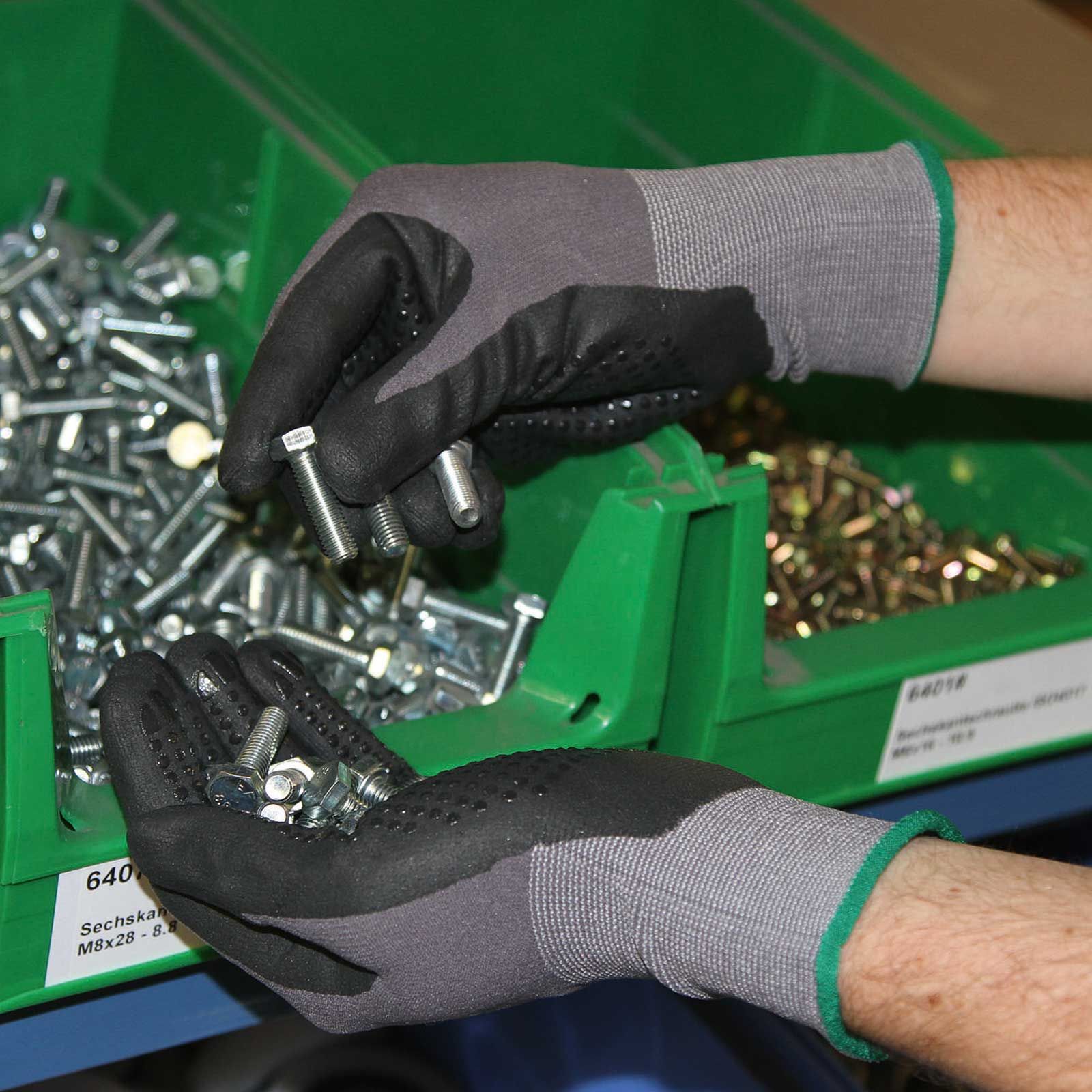 Akéz belső oldalán található noppingok nagyon jó száraz tapadási tulajdonságokat biztosítanak. Ez teszi az oldószermentes (DMF) kesztyűt tökéletesen alkalmassá a tapintásérzékenységet igénylő munkákhoz. A lehetséges felhasználási területek közé tartozik az autóipar, az összeszerelési munkák, az elektronika, a válogatás vagy akár a festési munkák.