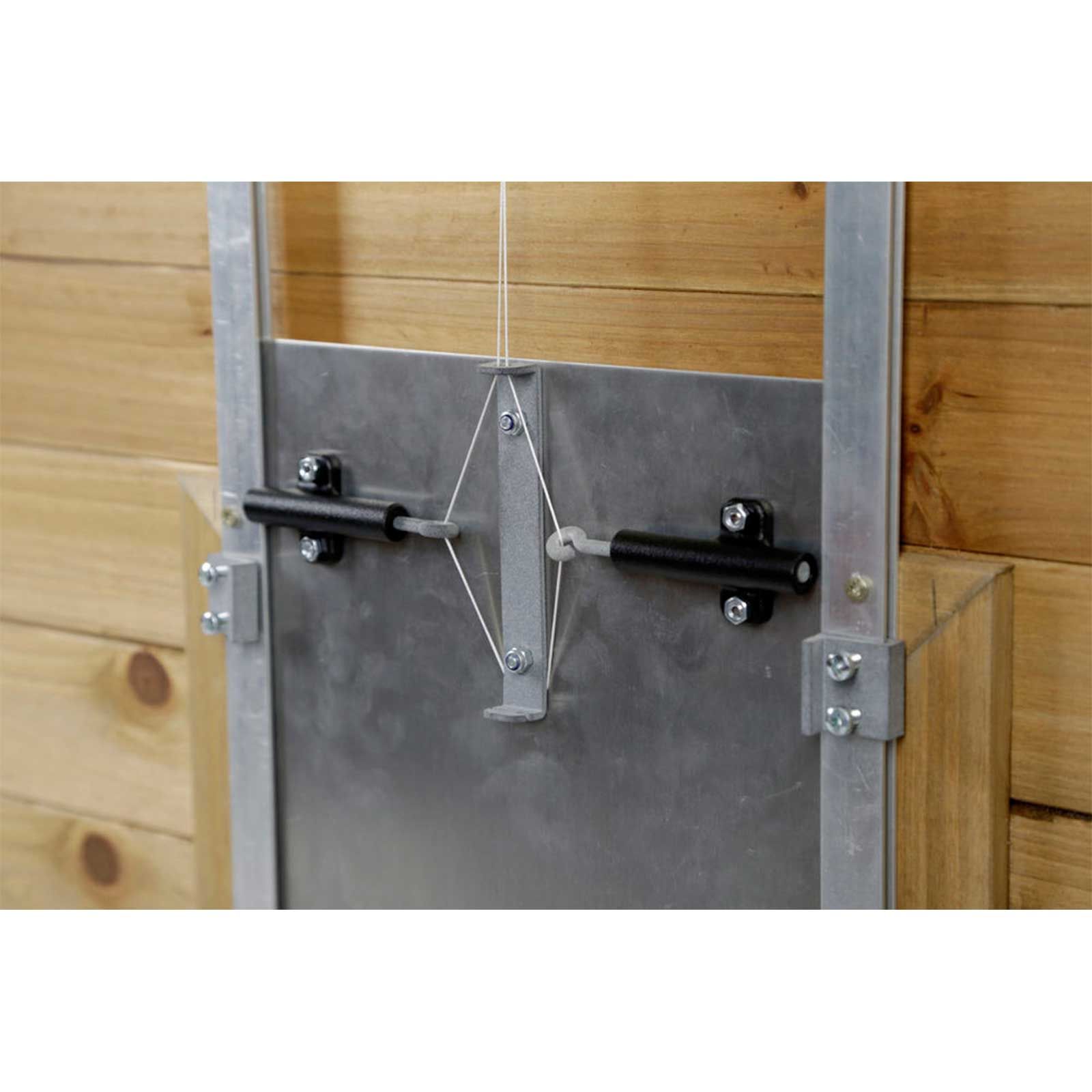 Az automata csirkeól ajtó tolóajtajához való utólagos felszereléssel a rókáknak, mosómedvéknek és társaiknak többé nincs esélyük. Az alsó ütköző elérésekor a csavarok reteszelik az ajtót. A tolóajtó most már nem emelhető fel, és az állatok biztonságban vannak a potenciális támadóktól.