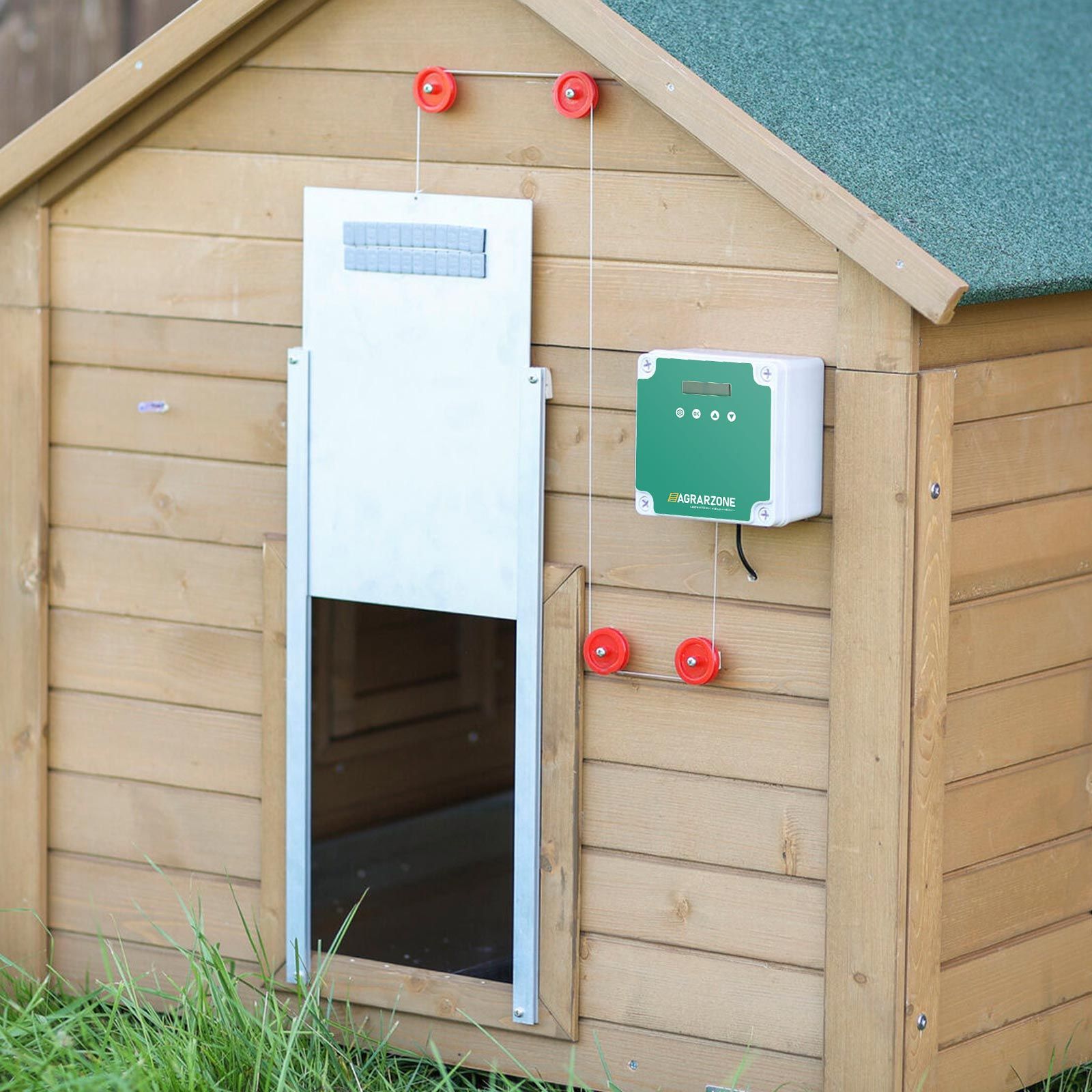 A fényérzékelős kapcsoló segítségével vezérelhető az automata csirkeól ajtó beépített motorja, így egy függőleges csúszka nyitása vagy zárása egy kábelhúzás segítségével valósul meg. Kézi működtetés is lehetséges. A tyúkól ajtó automata háza rendkívül stabil, és megvédi a finom elektronikát a nedvességtől, a szennyeződéstől és a napfénytől. A kissé védett helyzetben elhelyezett automata rendkívül hosszú ideig bírja a strapabíró alkatrészeinek köszönhetően.