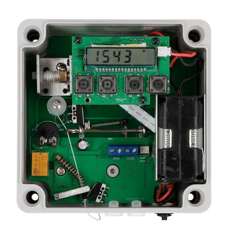 - Időzítő: A csirkeól ajtót az idő függvényében vezérli. Különbséget lehet tenni a hétköznapok és a hétvégék között.
