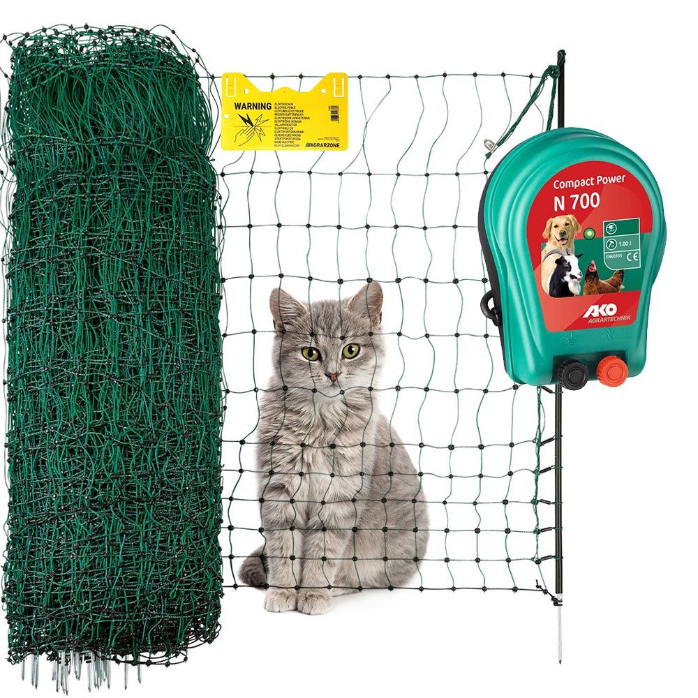 A készlet tartalmazza a 230 voltos AKO N700 villanypásztor készüléket csökkentett áramerősséggel, amelyet kifejezetten a háziállatok és kisállatok fajoknak megfelelő tartására fejlesztettek ki. A macskakerítés villamosítása megbízható elrettentő eszközként szolgál, azátugrást és átmászást a kerítésen hatékonyan megakadályozza. Az áramütés kellemetlen a háziállatok számára, de nem veszélyes.