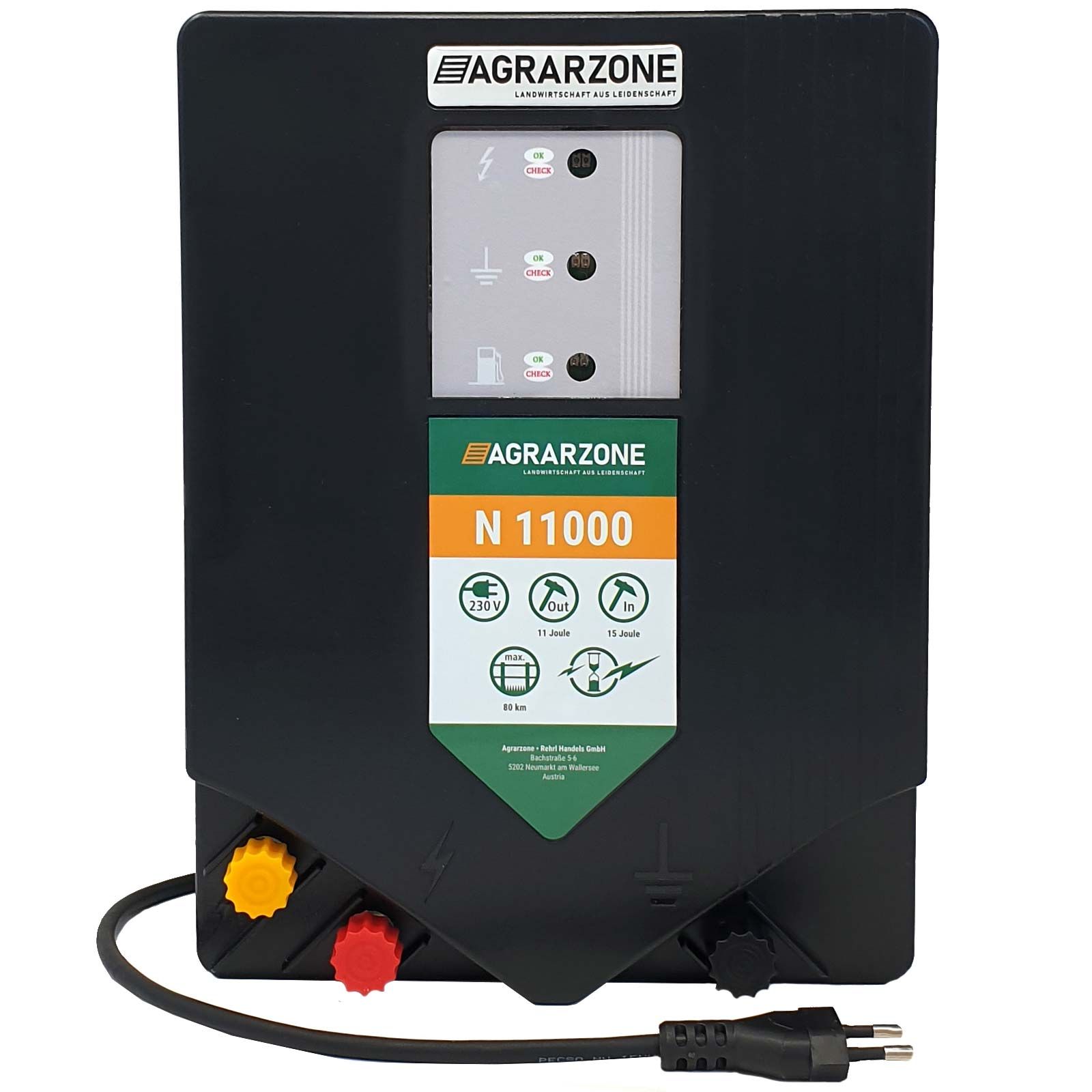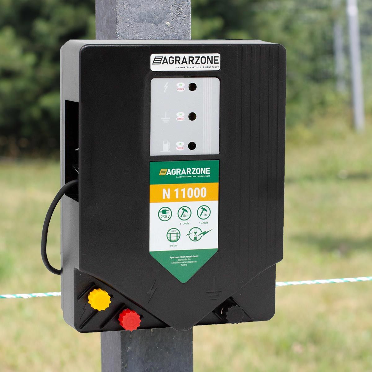 A nagy teljesítményű 230 voltos Agrarzone N 11000 villanypásztor készülékkel a kerítésrendszerek rendkívül széles skálája építhető. Legyen szó szarvasmarhatartásról, lólegelőről vagy vadállatok elriasztásáról - a villanypásztor készülék 15 joule töltési energiával és 11 joule maximális kisütési erővel rendelkezik, ezért ideálisan alkalmas a ma általánosan használt kerítés minden méretéhez. Az impulzus technológiának köszönhetően az Agrarzone N 11000 villanypásztor készülék biztonságosabban és kisebb energiafogyasztással működik, mint bármely hasonló modell.