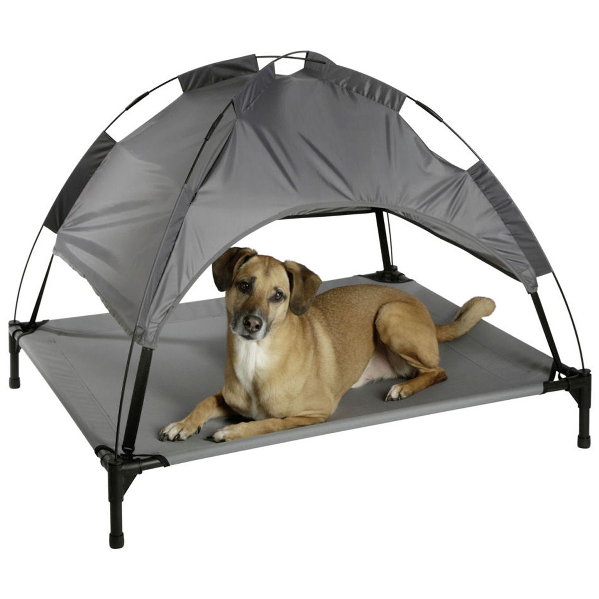 A kültéri kutyaágy időjárásálló, és megvédi kutyáját a hőtől és a hideg talajtól. A kutya nyugágyak beltéren és kültéren egyaránt használhatók, és praktikus megoldást jelentenek négylábú barátod hangulatos helyére. Ez a kényelmes kutyaágyszakadásálló Oxford anyagból készült. A levehető tető árnyékot ad, és nyáron véd a közvetlen hőtől. Háziállatok számára is nagyon alkalmas hideg napokon, mert az állat nem fekszik közvetlenül a hideg talajon. A csúszásgátló sapkák gondoskodnak a biztonságról.