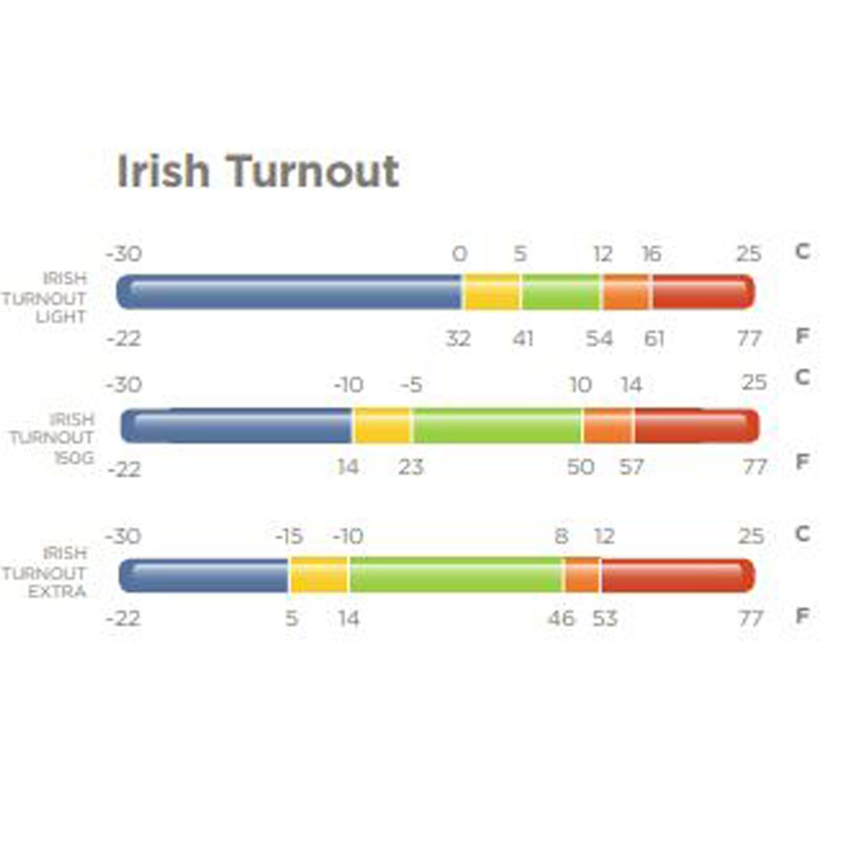 A Bucas Irish Turnout Light 50 g optimális hőmérsékleti tartománya 5 °C és 12 °C között van. Sok más tényezőtől függően, mint például nap, páratartalom, szél, a ló aktivitása, nyírt és nyíratlan, a takaró ezen tartományon felül/alul is használható.