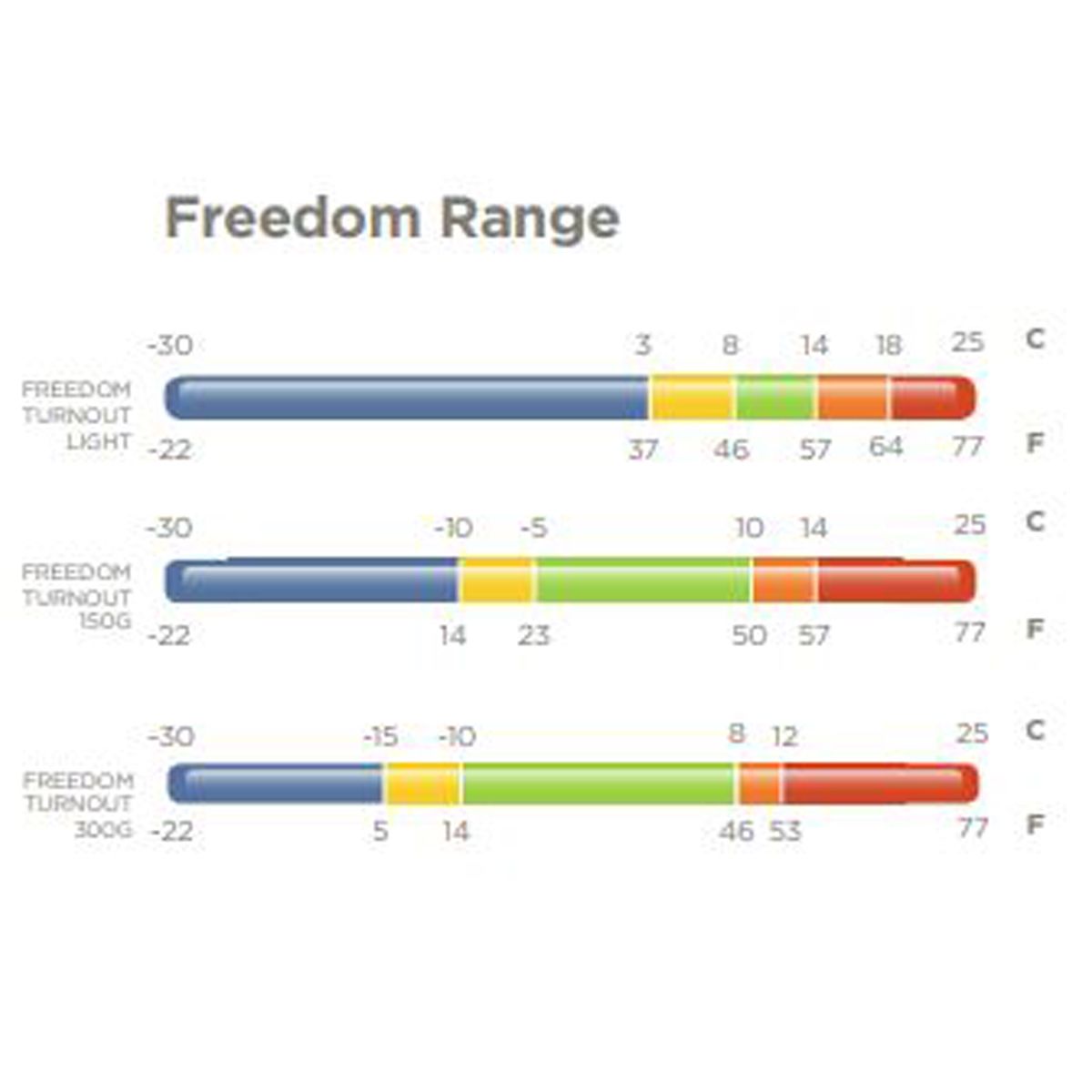 A Bucas Freedom Turnout Light lótakaró hőmérsékleti tartománya + 8°C és 14°C között van. Ez a tartomány azonban számos tényezőtől függhet, például a naptól, a páratartalomtól, a széltől, a lovak aktivitásától, a nyírt és a nyíratlan lóállománytól.