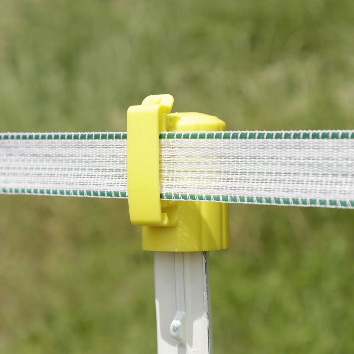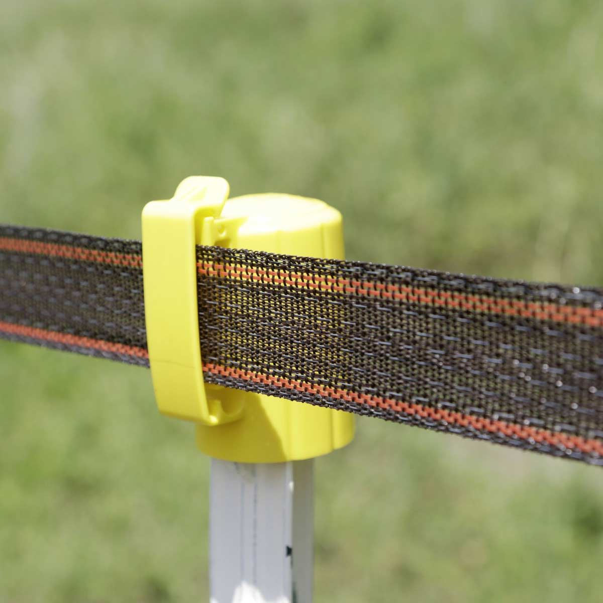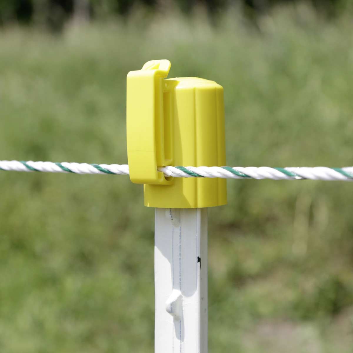A Premium fejszigetelő még biztosabban ül a T-oszlopon a továbbfejlesztett kialakításnak köszönhetően, az oszlopfővel ellátott foglalattal . Ütésálló, UV-stabil műanyagból készült, így tartós és stabil. A T-oszlophoz való rögzítés nagyon egyszerű: helyezze a szigetelőt az oszlop tetejére, vezesse át rajta a vezető anyagot, zárja be a kapcsot - kész! A T-oszlop szigetelő klasszikus fekete vagy a láthatóbb sárga jelzőszínben kapható. A sárga jelzőszín további elrettentő hatástkölcsönöz a fejszigetelőnek.