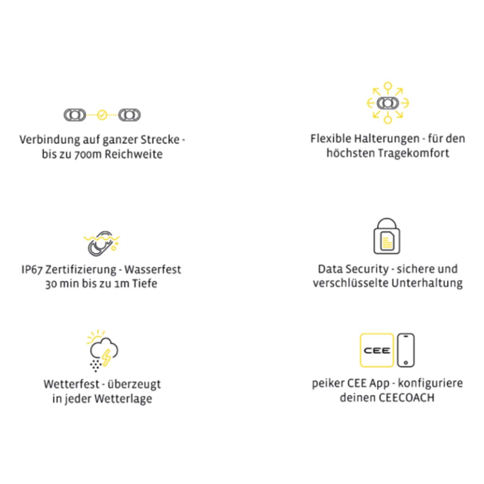 Az akár 16 fős csoportos szabadtéri sportolás különleges élménnyé válik az új peiker CEE kommunikációs rendszerrel, a CEECOACH PLUS-szal. A CEECOACH PLUS segítségével minden helyzetben kapcsolatban maradhat. A CEE Intercom technológiával a készülék akár 700 méteres hatótávolságú biztonságos hálózatot is képes létrehozni. Ez azt jelenti, hogy a CEECOACH PLUS optimalizálja a csapaton belüli koordinációt és interakciót is. A peiker CEE bevált kommunikációs rendszerének harmadik termékgenerációja mostantól akár 16 résztvevő egyidejűleg, kihangosítva is beszélhet.