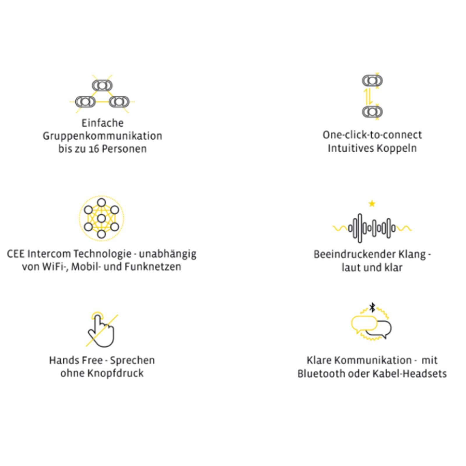 A CEECOACH PLUS kültéri kommunikációs rendszer ideális csapatpartner a sport- és szabadidős tevékenységekhez legfeljebb 16 résztvevő számára.