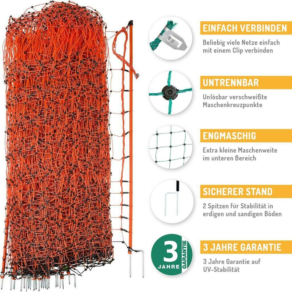 (tartalmazza: 1x kerítés csatlakozókábel, 1x földelő kábel, 1x csatlakozókábel 12V, 1x hálózati adapter 230V, 1x használati utasítás). - 1x birka háló, 50 m, 90 cm, dupla csúccsal, narancssárga, villamosított