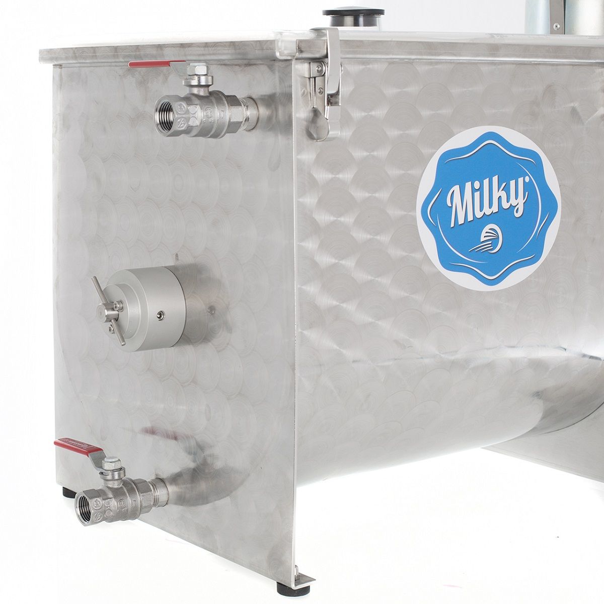 Elektromos vajkészítő gép FJ 32 / 230 V professzionális használatra! A tejszín hőmérsékletétől és a tej zsírtartalmától függően a Milky FJ 32-nek 20 és 35 perc közötti időre van szüksége egy folyamathoz. Töltsön 6-13 liter tejszínt a 32 literes rozsdamentes acéltartályba (legfeljebb a kivehető rozsdamentes acél keverőtengelyig), és kezdje el a keverést.