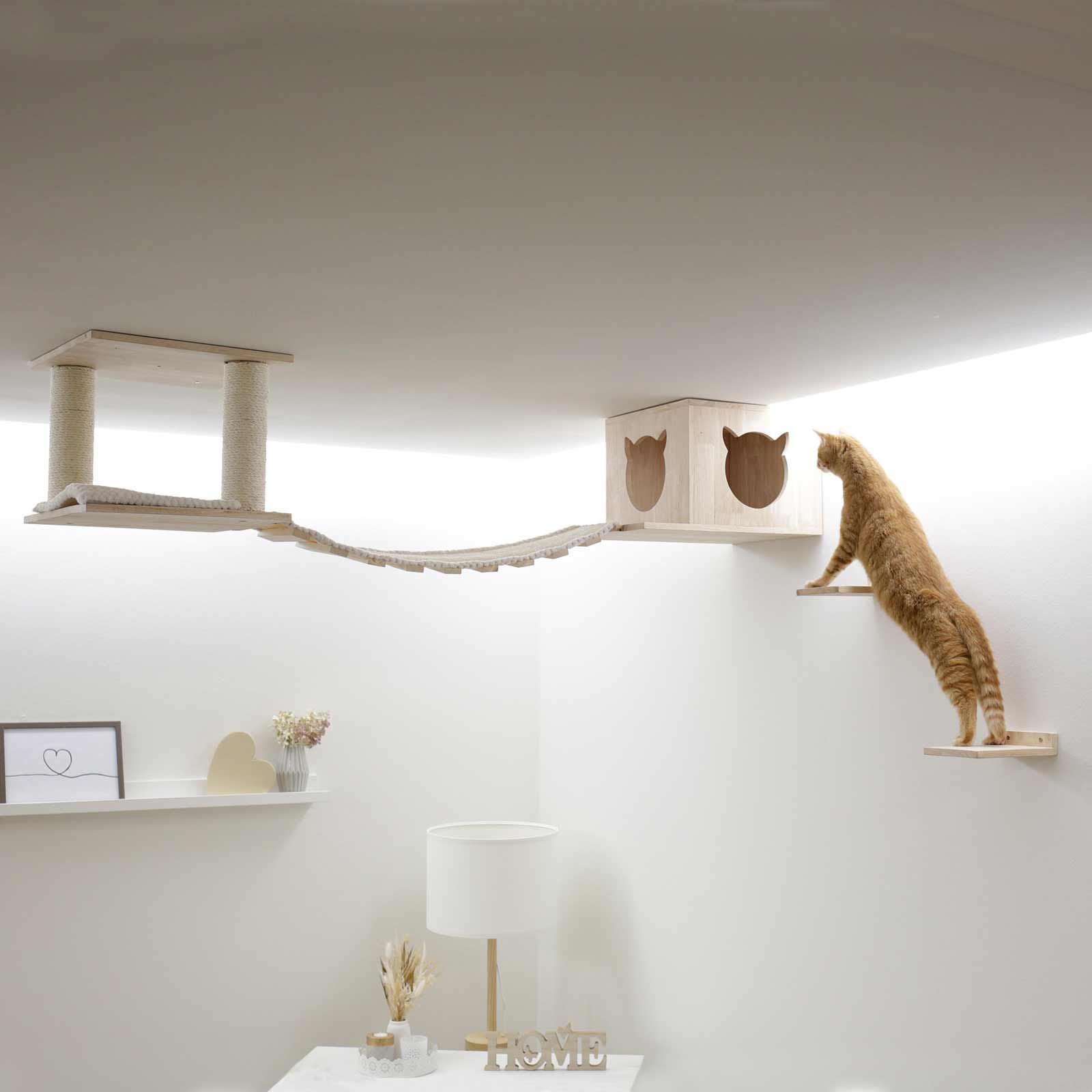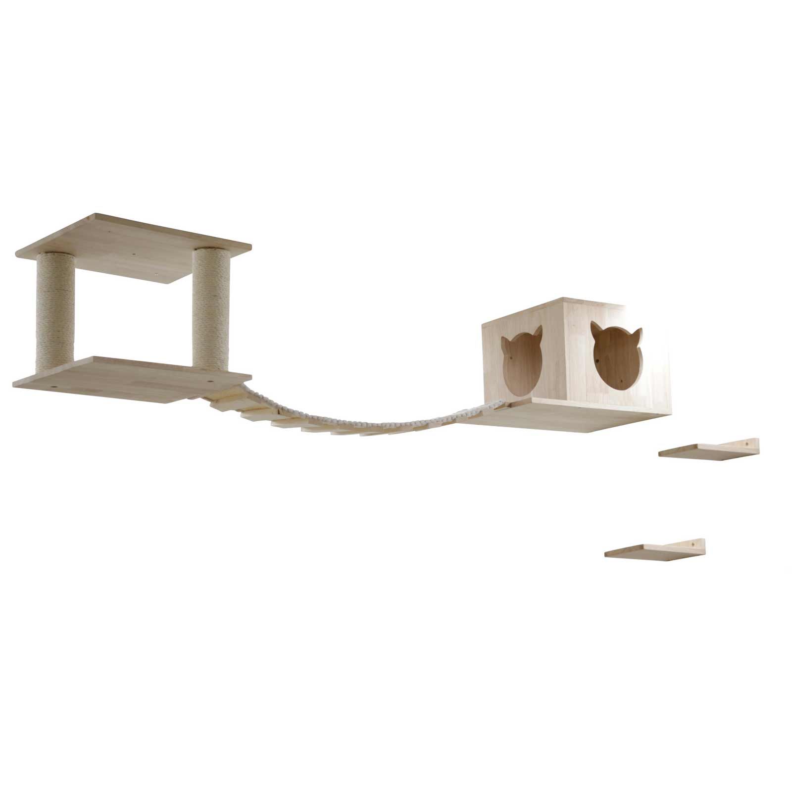 Tervezz egy teljesen egyedi mászófalat kedvence számára. Egyszerűen helyezze el az 5 elemet ízlése szerint, és kínáljon macskájának rengeteg lehetőséget a vakarózásra és a játékra. Ebben a készletben egy hangulatos barlangot kapsz hangulatos párnával, egy fekvőhelyet szizáloszlopokkal, amelyek kaparni invitálnak, valamint egy függőhidat és két lépcsőt a macskajátszótérhez.