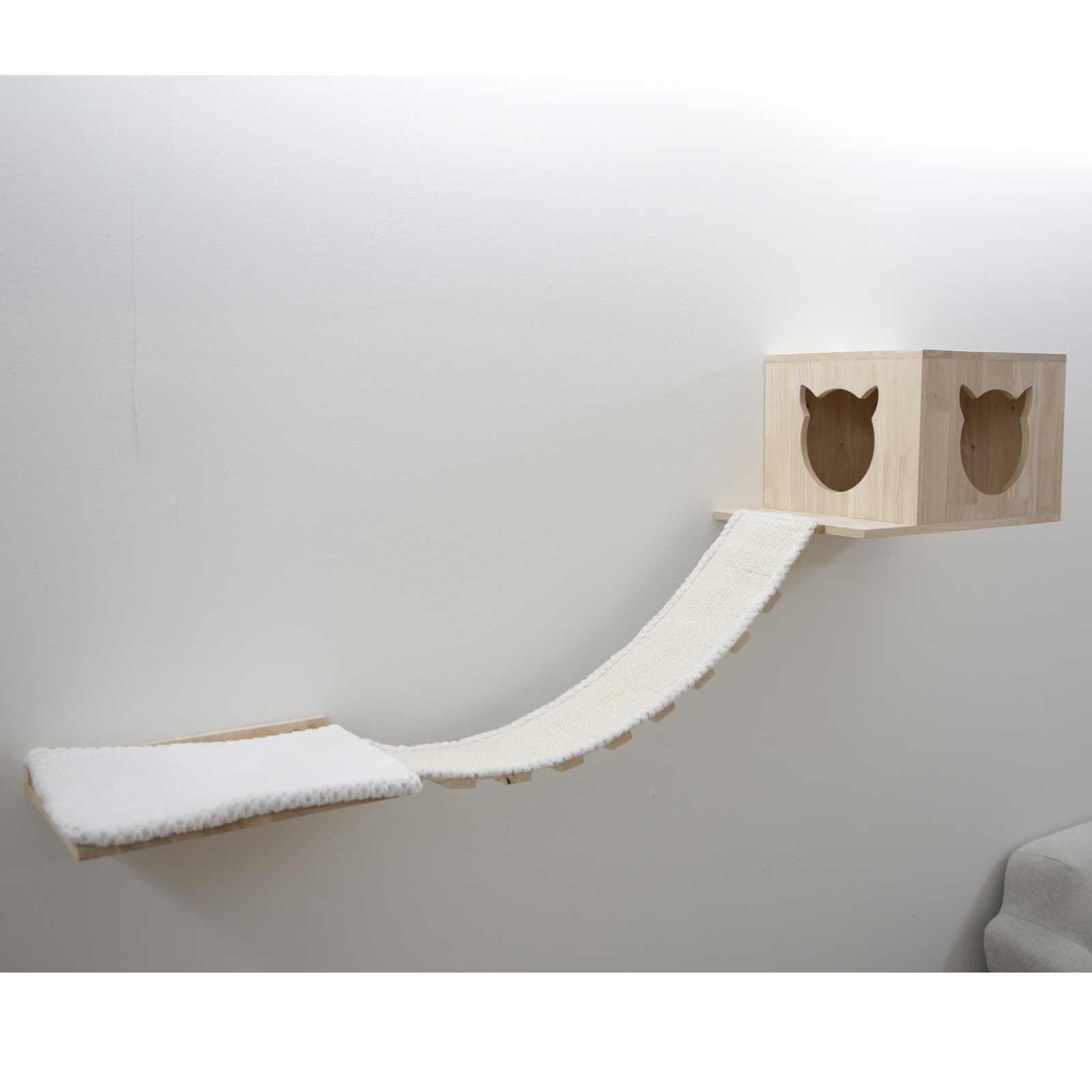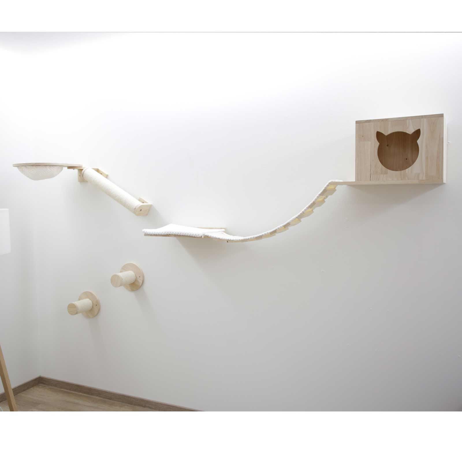 Tervezz egy teljesen egyedi mászófalat kedvence számára. Egyszerűen helyezze el a 7 elemet ízlése szerint, és kínáljon macskájának rengeteg lehetőséget a vakarózásra és a játékra. Ebben a készletben kapsz: kényelmes nyugágyat alváshoz, szizál oszlopot, ami karcolásra vagy rámpaként is használható, valamint egy párnázott nyugágyat, amelyet függőhíd és két körlépcső köt össze egy barlanggal.< /p>