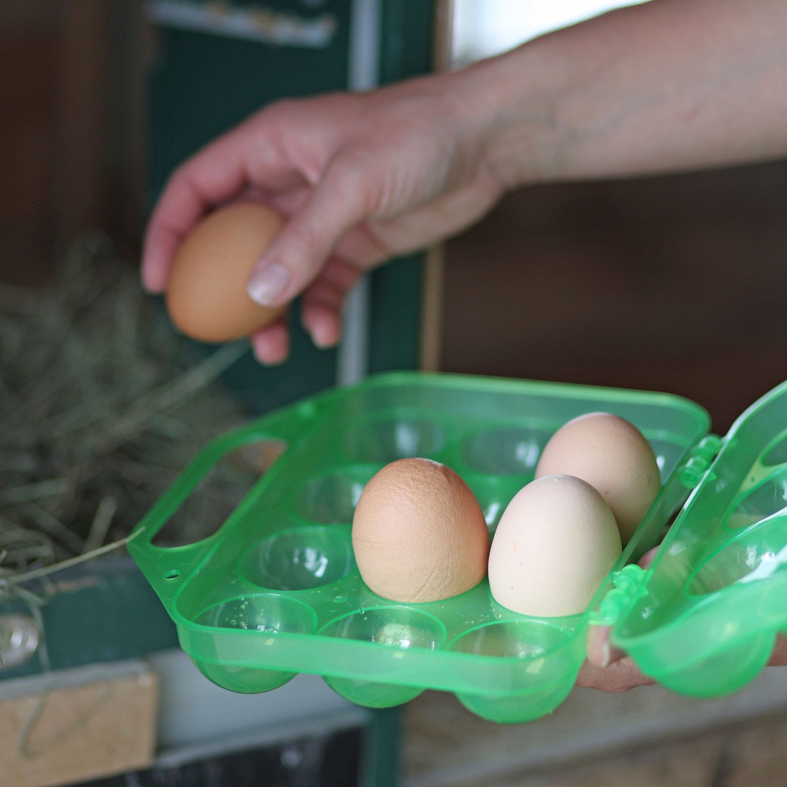 A hordozófogantyúval ellátott tojástároló dobozban kényelmesen szállíthat és tárolhat akár 12 friss tyúktojást is.