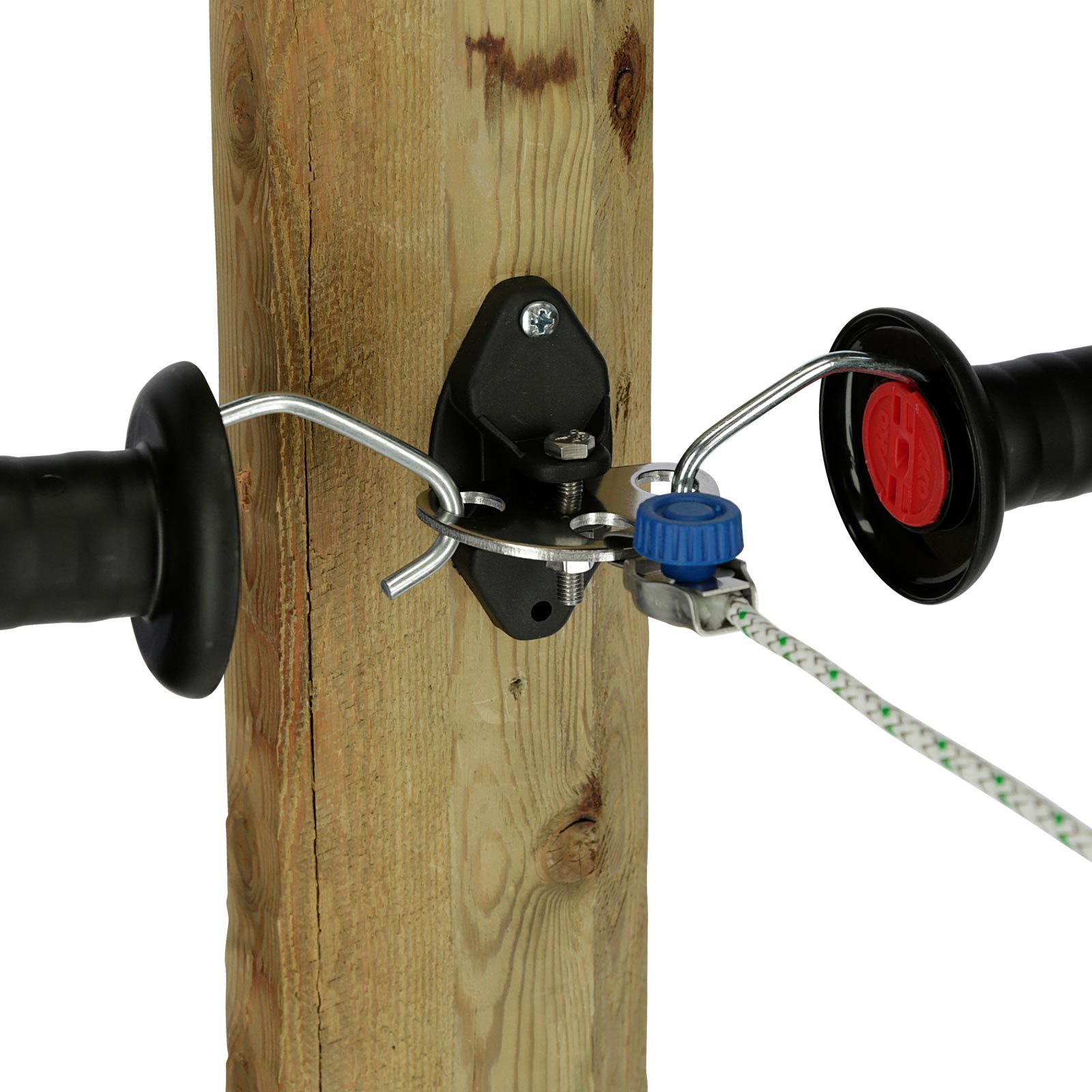 Ez a kiváló minőségű, szabadalmaztatott Premium villanypásztor kötél/zsinór gyorscsatlakozó lehetővé teszi a vezetőanyagok gyors, egyszerű és elektromosan optimálisan vezető csatlakoztatását a kapuszigetelőkhöz és a kapu fogantyúihoz. A csatlakozó alkalmas szálakhoz, kötelekhez 8 mm-ig és keskeny szalagokhoz 10 mm-ig.
