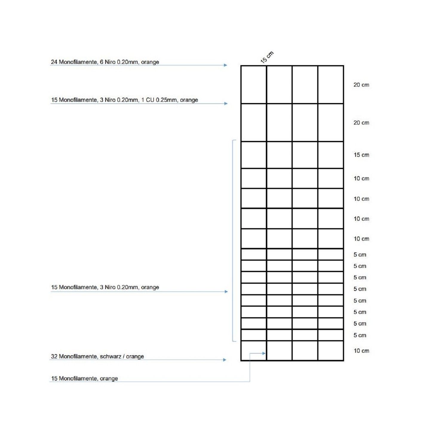 - 17 vízszintes szál, amelyből 16-ban króm-nikkelhuzal van beépítve (3 rozsdamentes acél 0,20 mm, felső szál: 6 rozsdamentes acél).