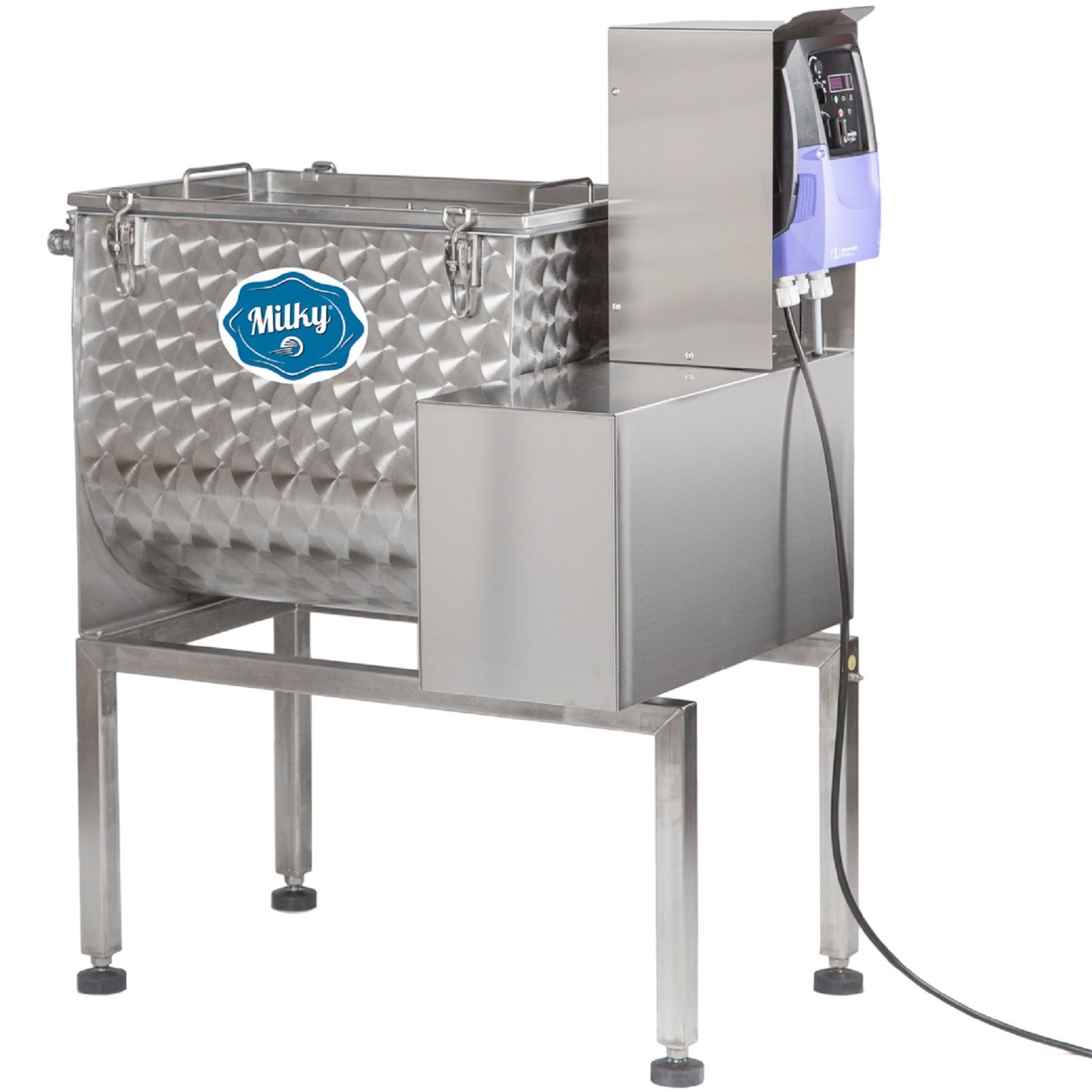 Ezzel géppel a tejszín hőmérsékletétől és zsírtartalmától függően mindössze 20 és 35 percre van szükségünk egy folyamathoz. A keverés megkezdéséhez 10-25 liter tejszínt kell a rozsdamentes acél tejszíntartályba önteni, legfeljebb a keverőtengelyig. Az egyedülálló, extra nagyméretű szemlélőfedélen keresztül követhető a keverési folyamat. A fedél működés közbeni kinyitásakor az automatikus biztonsági STOP megakadályozza a baleseteket. A többlépcsős, 750 W-os, 230 V-os motornak köszönhetően rövidebb vagy hosszabb készítési idő is lehetséges. A vajkészítés során keletkező írót egyszerűen le kell ereszteni a külön lefolyócsappal, majd a vajat meg kell mosni, és máris kész a kiváló minőségű termék.