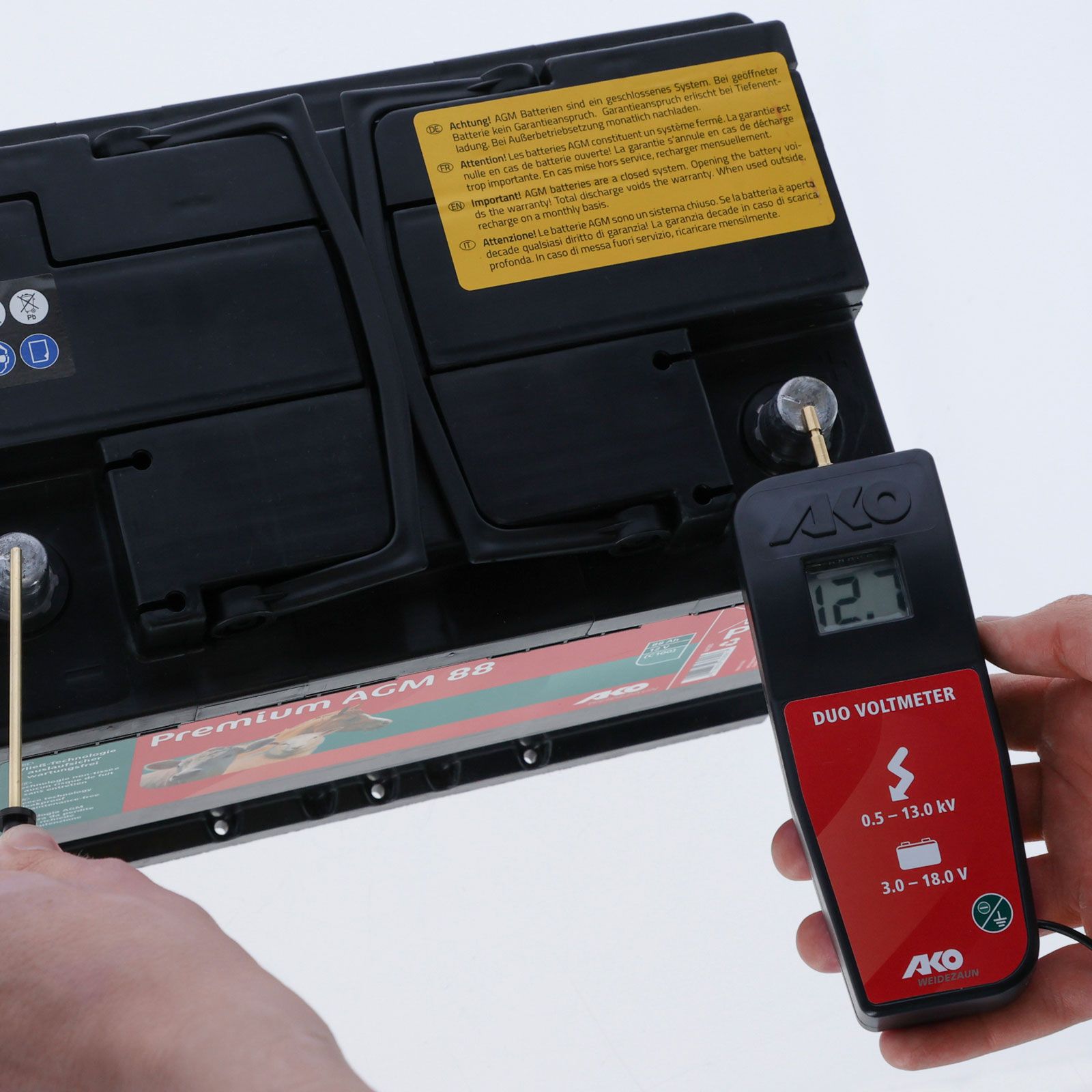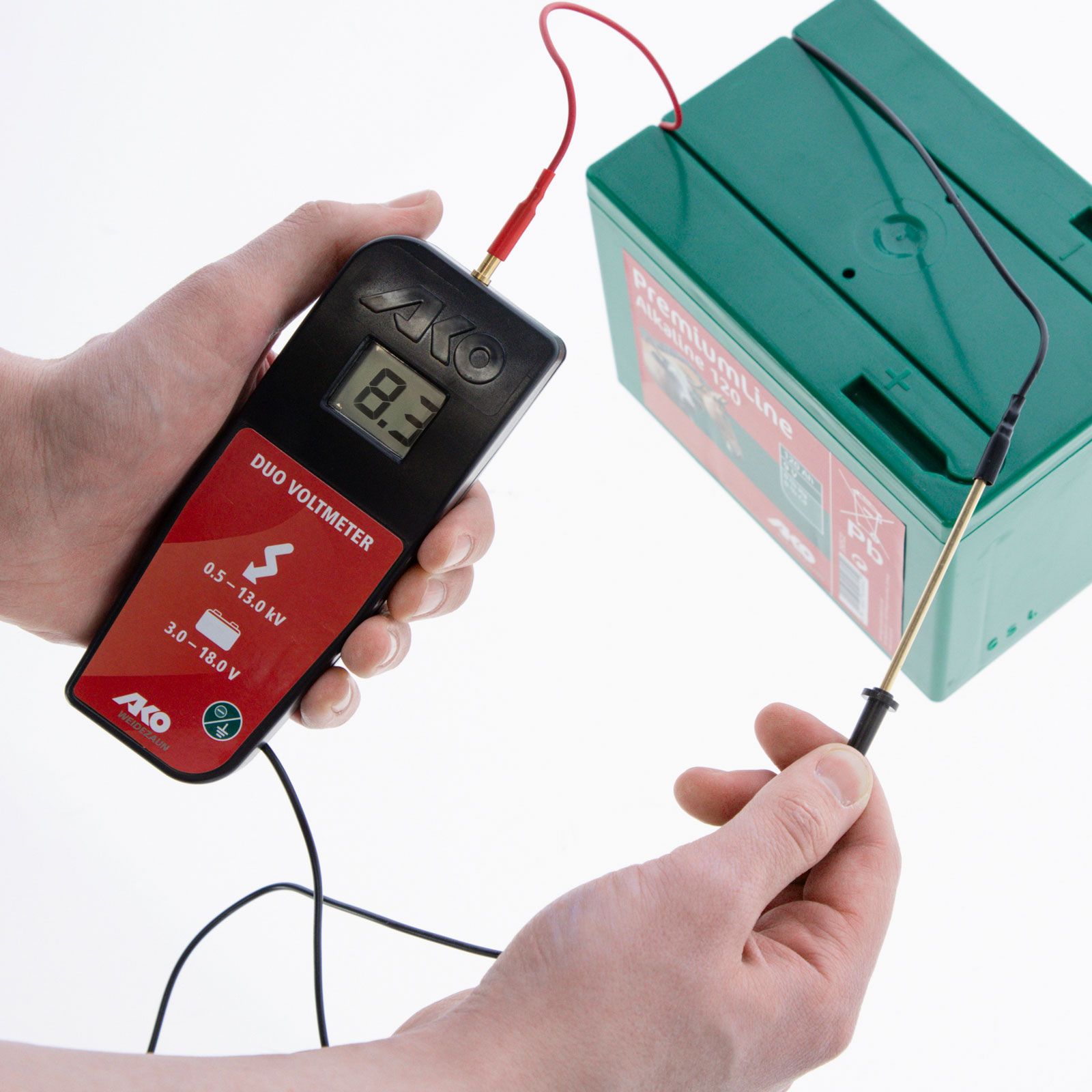 Ez az új, innovatív AKO feszültségmérő egy "minden egyben" kerítésfeszültségmérő. A készülék ellenőrzi a villanypásztorok, a 9 V-os elemek és a 12 V-os újratölthető elemek feszültségét. A hagyományos feszültségmérők csak a kerítésfeszültséget mérik, de az alacsonyabb akkumulátorfeszültségeket nem tudják leolvasni. A multiméterek viszont alkalmasak az elemek és akkumulátorok vizsgálatára, de az elektromos kerítések magas feszültségének mérésekor károsodnak. Ez az AKO DUO feszültségmérő egyetlen, megfizethető árú eszközzel ellenőrzi a magas és alacsony feszültségeket. A készülék használata egyszerű és intuitív. A digitális kijelző lehetővé teszi a mért érték pontos megjelenítését. A készülék vagy kerítés magasfeszültségét kilovoltban mérik (0,5 - 13,0 -> 500 - 13000 V). Az akkumulátor feszültsége voltban van megadva (3 - 18 V között), az e feletti értékeket "Hi" jelzi. Az intelligens energiatakarékos technológia extra hosszú akkumulátor-üzemidőt tesz lehetővé. A készülék működtetéséhez szükséges 9 voltos blokkelemet a készülék tartalmazza.