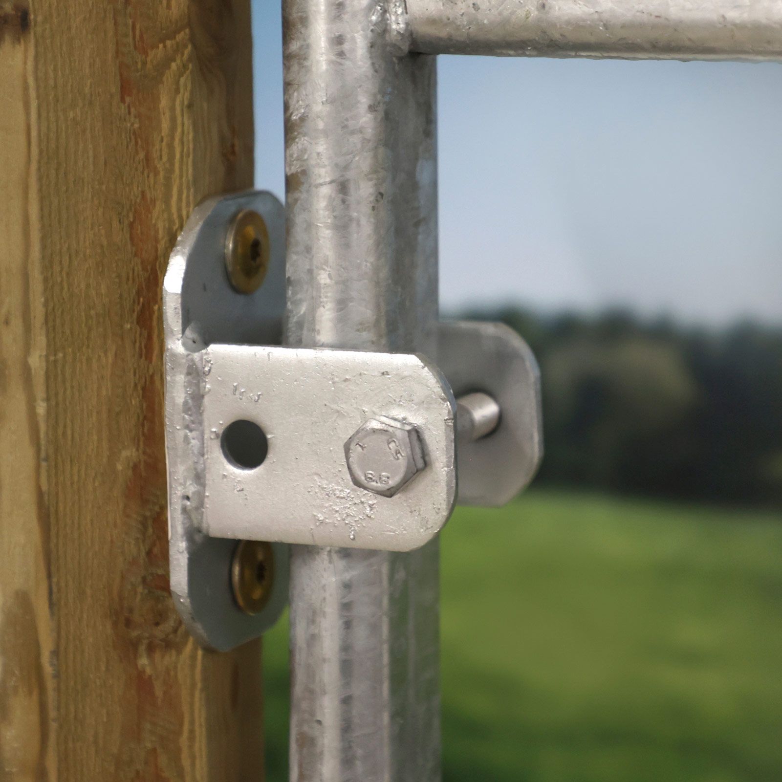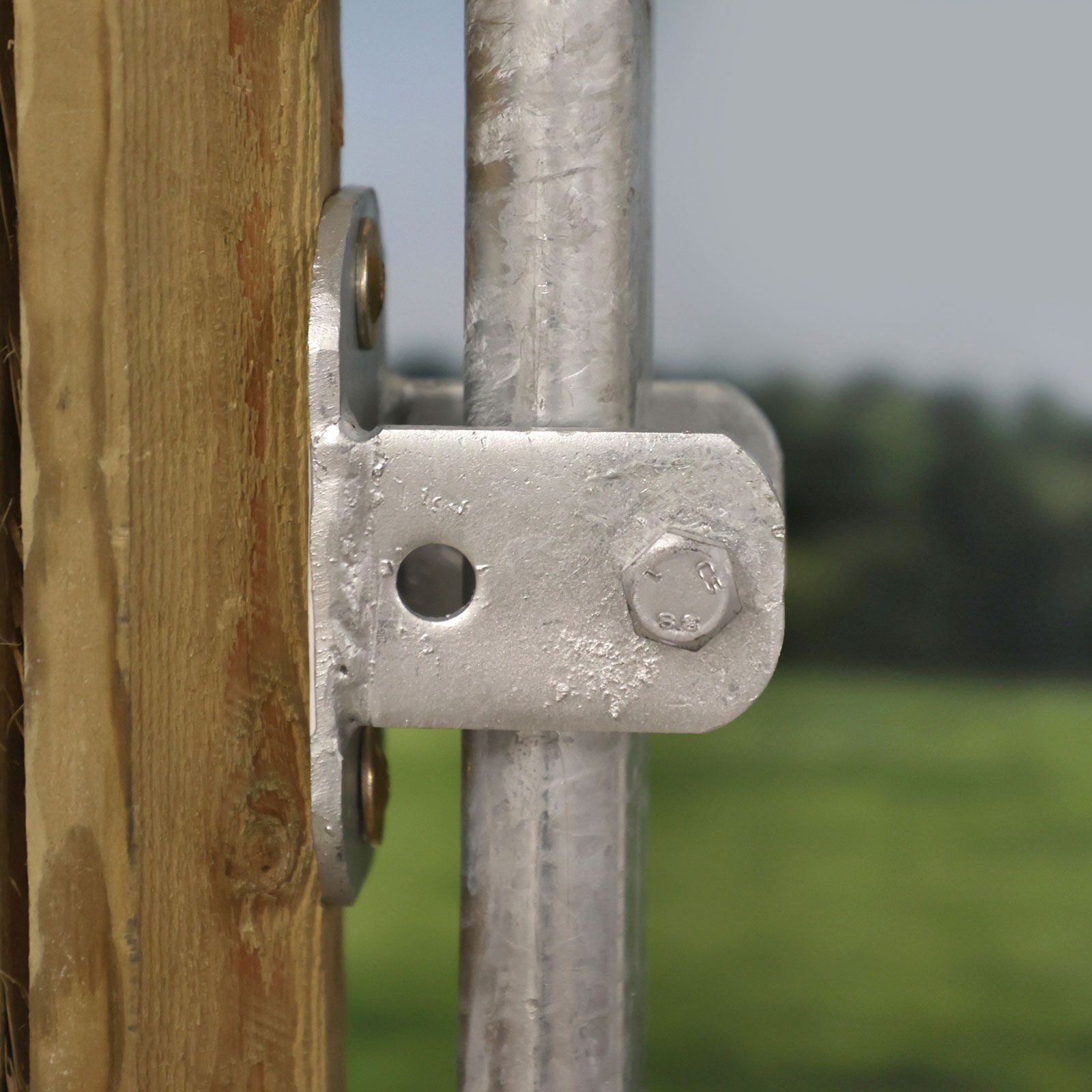 Ez a fal- és padlórögzítő elem a kerítéspanelek falhoz vagy padlóhoz történő rögzítésére szolgál. A falhoz közeli csavar elhagyásával a panelek enyhe szögben is rögzíthetők, hogy kiegyenlítsék a terep kisebb lejtéseit vagy emelkedéseit. A csavarozható rész tartós, tűzihorganyzott fémből készült. A panelek könnyen felszerelhetők a falra vagy a padlóra csavarozással.