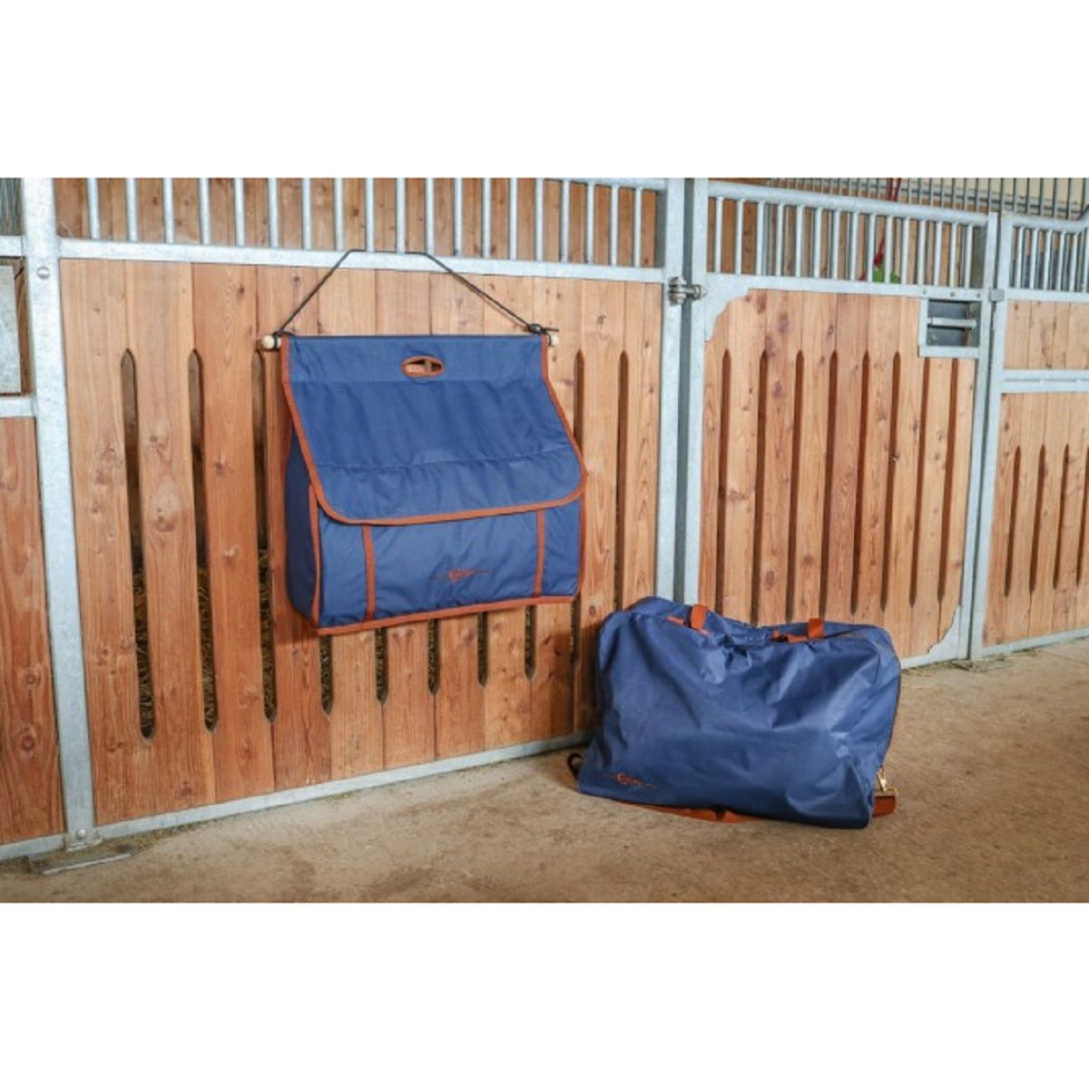 A takaró méretétől függően akár 5 lótakaró is tárolható a takarótáskában. A nagyméretű cipzár megkönnyíti a takarók vagy más használati tárgyak rendezett és könnyed tárolását. A lótakaró táska két hordozófogantyúval és egy levehető vállpánttal van ellátva. A masszív alap megakadályozza, hogy a táska felboruljon, amikor leteszi.