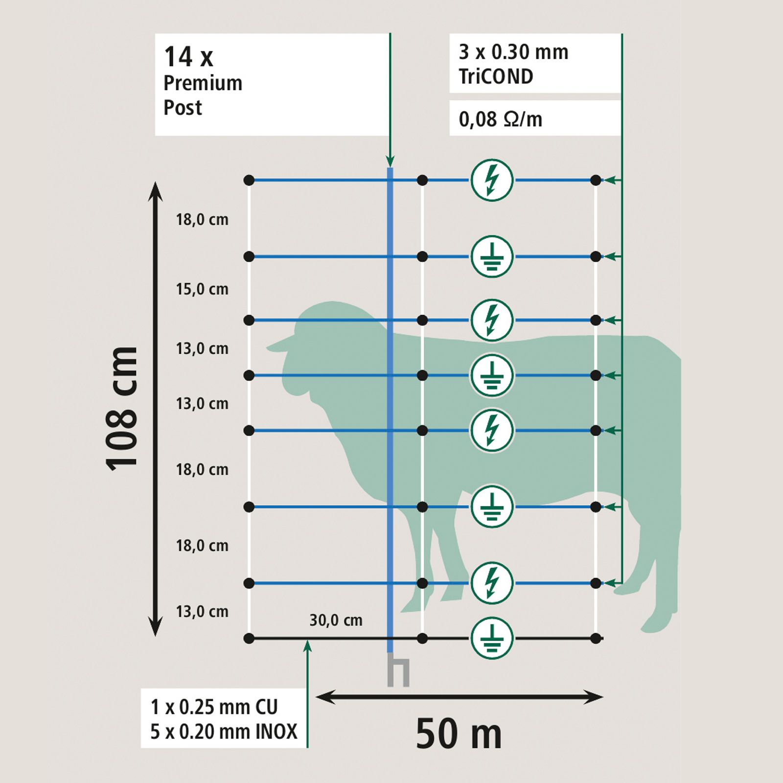 A farkasriasztó háló kiváló vezetőképességet ér el a vízszintes áramvezetés révén, szálanként 3 x 0,30 mm-es TriCOND vezetőanyaggal. A TriCOND vezetőhuzalok 5-ször nagyobb vezetőképességűek, mint az azonos vastagságú hagyományos rozsdamentes acélhuzalok, és így maximális védelmet nyújtanak - még nagy távolságokon is. E huzalok speciális bevonata teszi az anyagot robosztussá és biztosítja a hosszú élettartamot. Az opcionálisan csatlakoztatható megerősített földelő vezeték a háló teljes hosszában történő földeléshez optimális a nehéz talajviszonyok (pl. nagyon homokos vagy száraz talajok) esetén. Az erős függőleges merevítők 30 cm-es közönként tartósan kapcsolódnak a vízszintes merevítőkhöz, és így még dombos és egyenetlen talajon is kompakt állványt biztosítanak.