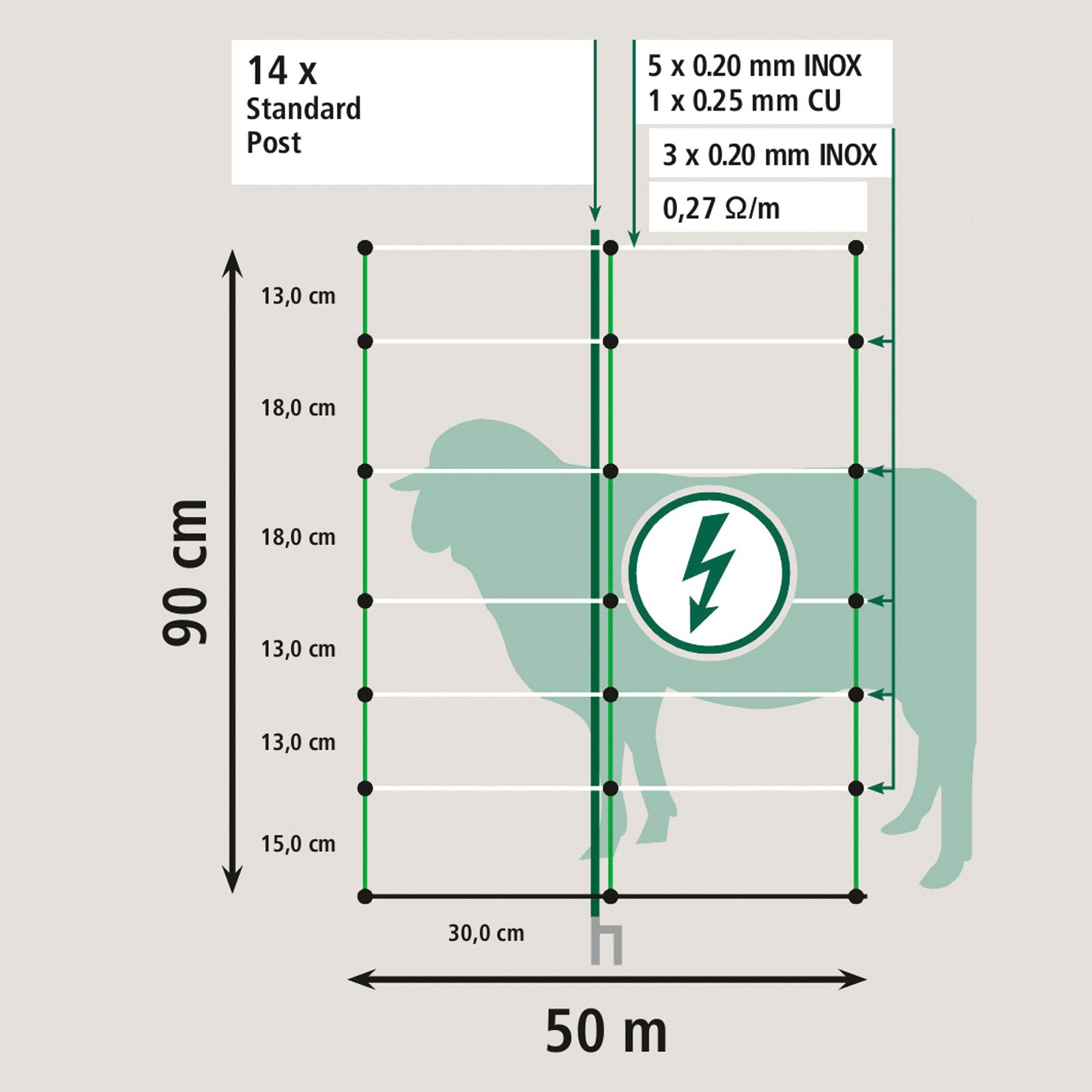 14 erős műanyag karó horganyzott alsó végekkel szilárdan tartja a hálót a földben, és megakadályozza, hogy megereszkedjen. Ezek maguk is tartalmaznak egy-egy fejszigetelőt és egy földdugót a szál rögzítésére. A megerősített, áramvezető felső szál nagy vezetőképességet és hatékony terelésvédelmet biztosít 5 rozsdamentes acélvezető és egy ónozott rézvezető alkalmazásával. A jó burkolati tulajdonságokat a műanyag tömítés is biztosítja minden egyes háló keresztpontján, amely eltávolíthatatlanul hegesztett. A praktikus rozsdamentes acélból készült kapcsok lehetővé teszik, hogy több juhhálót egymás mögé helyezzen, és könnyen összekapcsolja őket.