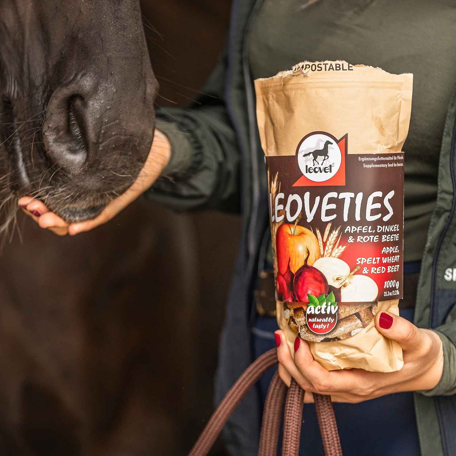 A Leoveties finomságok a Leovet-től egészséges jutalomfalatok lovak számára. Az alma ásványi anyagokat és gyümölcssavat biztosít a ló jólétéhez. A tönkölybúza pozitív hatással van az emésztésre és a tűrőképességre. A céklát erőgumónak tekintik, és rendkívül sok vitamint és ásványi anyagot tartalmaz. Az összes összetevőt kíméletesen, alacsony hőmérsékleten keverjük össze a finom Leoveties lócsemegék előállításához.