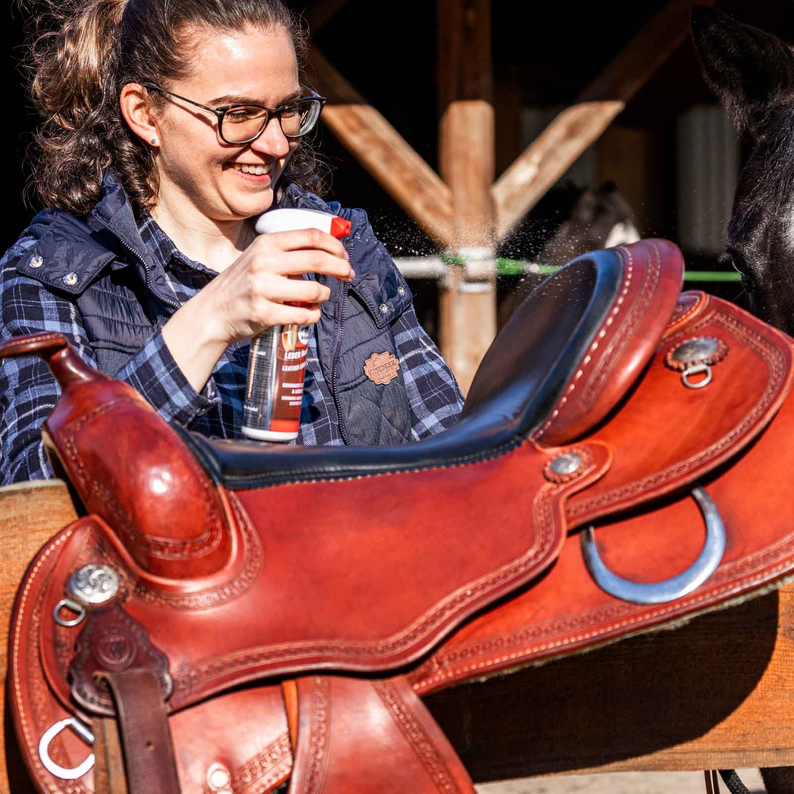 A Leovet bőrtisztító és ápoló gyors spray egyszerre tisztítja és ápolja a sima bőrt. Legyen szó nyeregről, kantárról vagy csizmáról - az igénybevett bőr tartósan felfrissül és védett lesz. A nyeregszappan és a bőrzsír kombinációja gyönyörű és természetes fényt ad. A szórófejes flakonnal a bőrápoló kombináció mindenhol alkalmazható, a bőr pedig szivaccsal vagy ronggyal tisztítható.